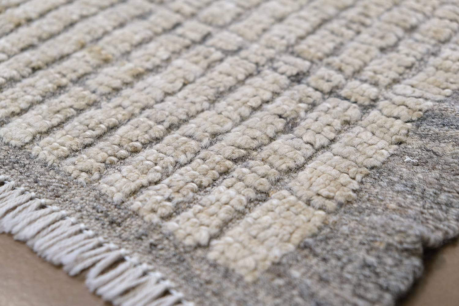 Hand-knotted using hand-spun wool pile. This rug offers a rich texture, resulting in a soothing feel underfoot. It's a blend of traditional craftsmanship with a contemporary design, making it a versatile option for many home decors.
