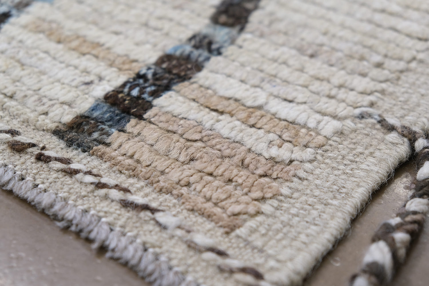 Hand-knotted using hand-spun wool pile. This rug offers a rich texture, resulting in a soothing feel underfoot. It's a blend of traditional craftsmanship with a contemporary design, making it a versatile option for many home decors.