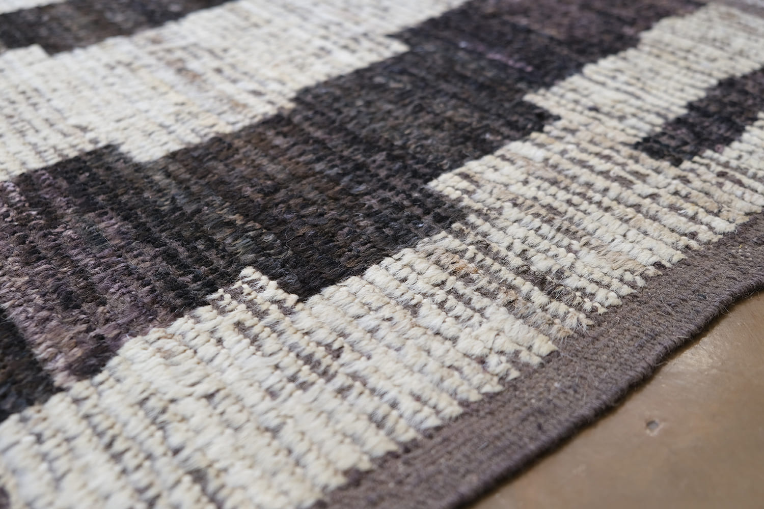 Hand-knotted using hand-spun wool pile. This rug offers a rich texture, resulting in a soothing feel underfoot. It's a blend of traditional craftsmanship with a contemporary design, making it a versatile option for many home decors.