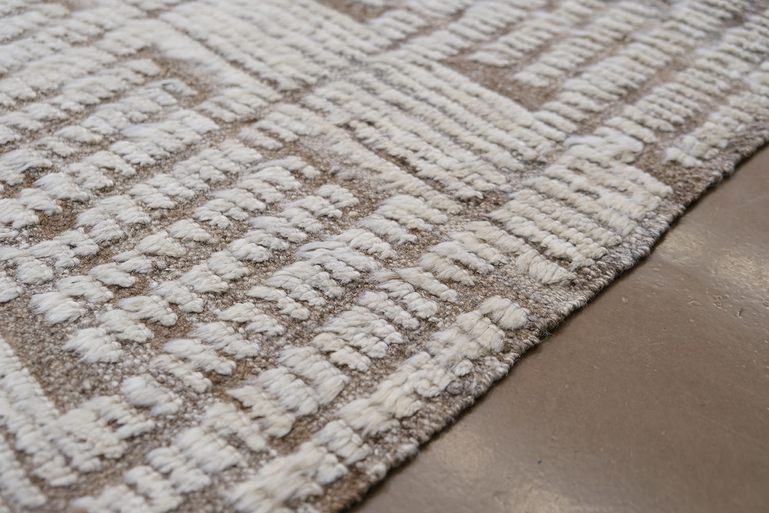 Hand-knotted using hand-spun wool pile. This rug offers a rich texture, resulting in a soothing feel underfoot. It's a blend of traditional craftsmanship with a contemporary design, making it a versatile option for many home decors.