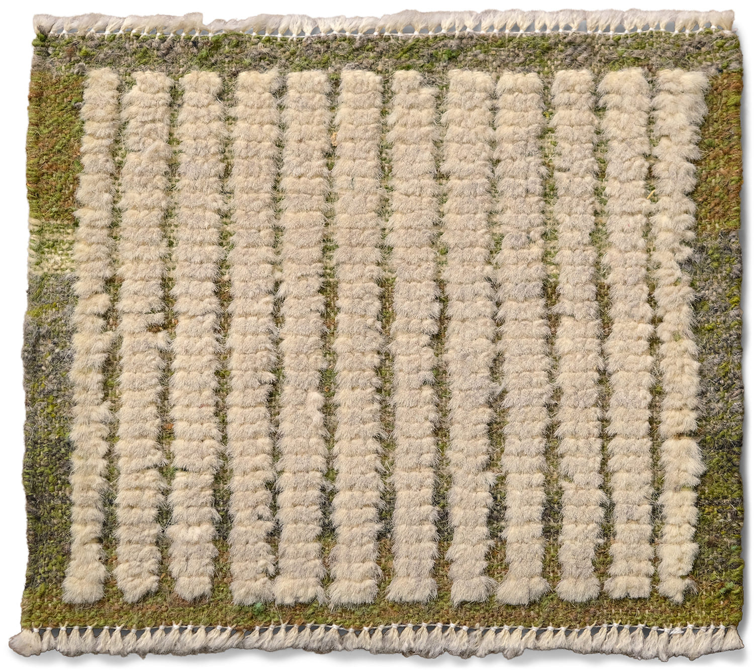 This hand-knotted wool rug showcases a rich texture, offering a tactile experience underfoot. Its neutral palette, accented with subtle green, provides an earthy yet elegant aesthetic suitable for various room settings. Finished with a clean fringe, this rug blends traditional craftsmanship with a contemporary design, making it a versatile addition to any home decor collection.