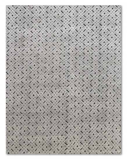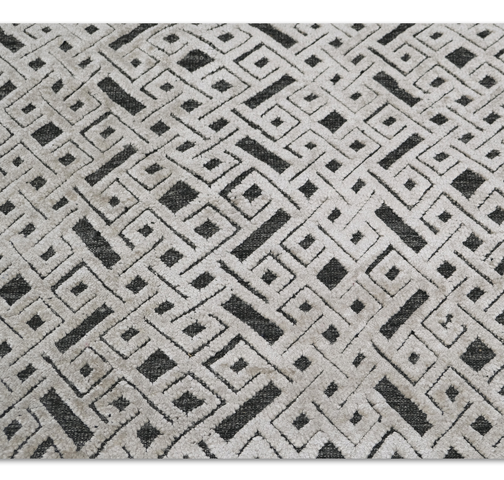 This magnificent rug epitomizes the union of traditional craftsmanship and contemporary design. Hand-knotted with the utmost precision, it seamlessly integrates the warmth and durability of wool with the lustrous sheen of Bamboo silk. Upon close examination, the rug reveals a highly detailed, intricate geometric pattern that is both repetitive and mesmerizing. The design consists of interlaced motifs, each forming a maze-like structure that offers depth and movement to the overall appearance.