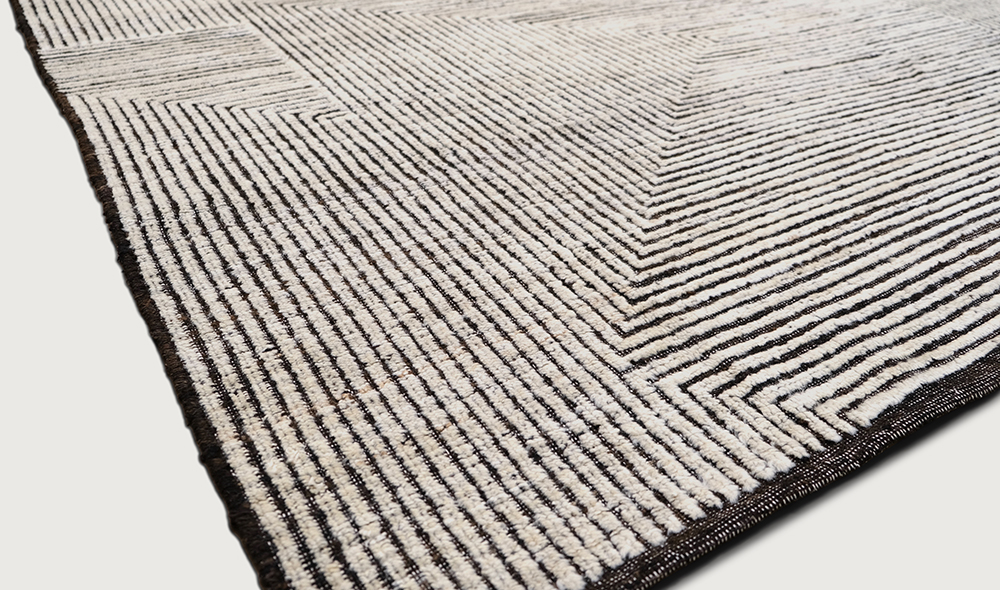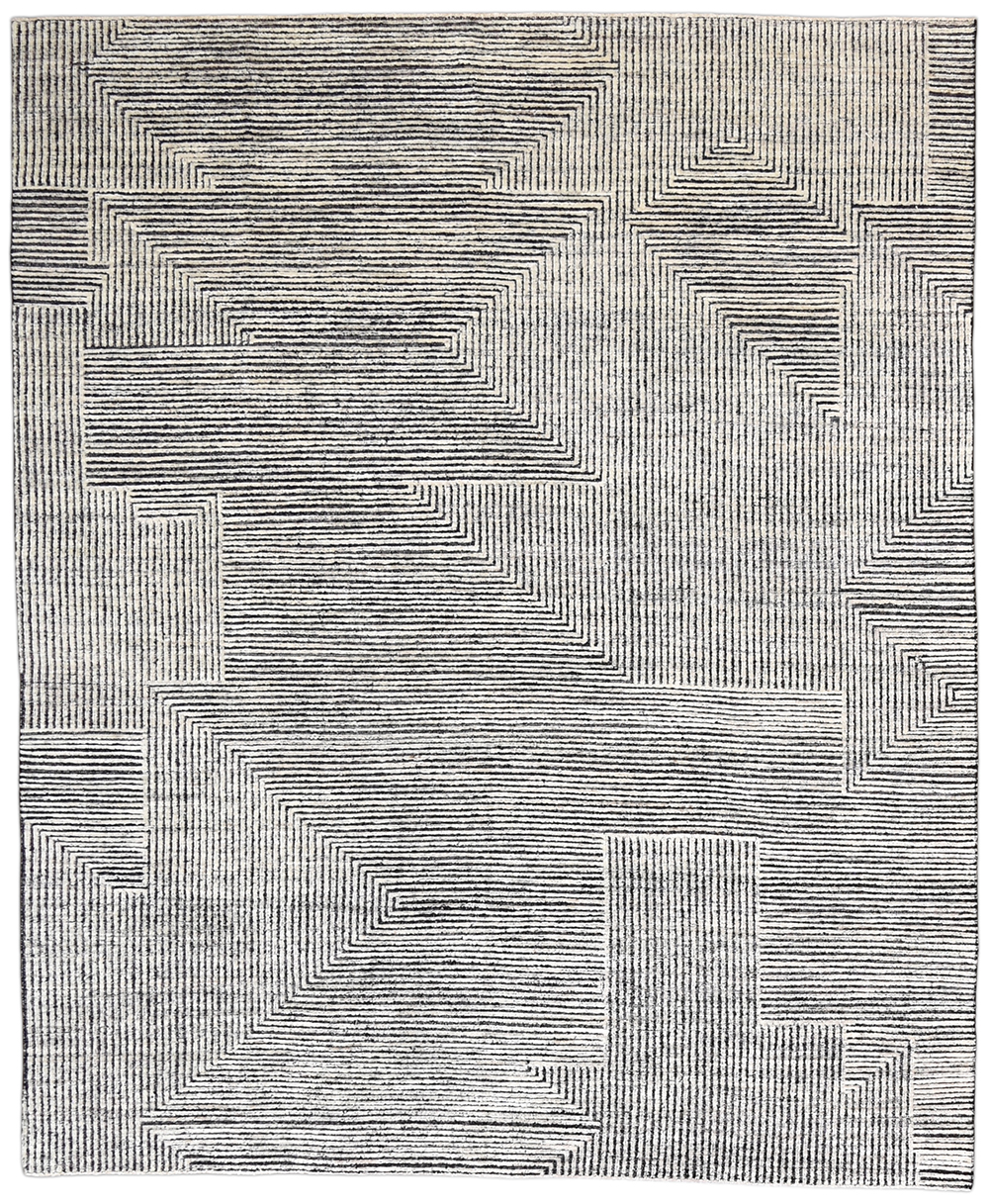 "This meticulously hand-knotted rug is a testament to timeless craftsmanship, woven exclusively from natural, non-dyed wool. It showcases the inherent beauty of undyed wool, bringing forward subtle variations in shade that are intrinsic to the fiber, resulting in a harmonious play of neutral tones. The rug features a modern geometric design, characterized by concentric rectangles and zigzag patterns. These angular forms are rendered in alternating bands of tightly woven textures, creating a r