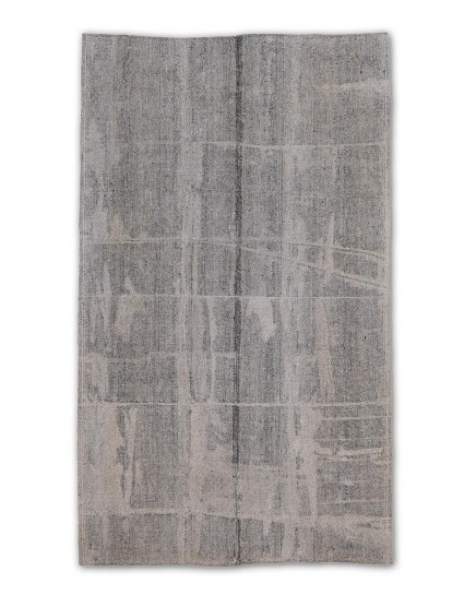 A beautiful vintage kilim is handwoven by Master Artisans using handspun goat hair in Turkey. Kilims are flat woven rugs in a technique that comes from Anatolia, parts of Iran, the Caucasus, and Turkestan. This Mazandaran style minimalist kilim offers simple designs in natural colors.