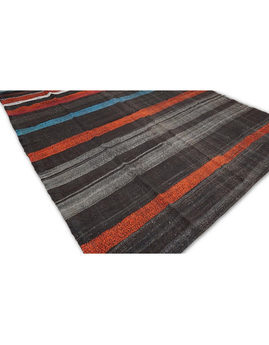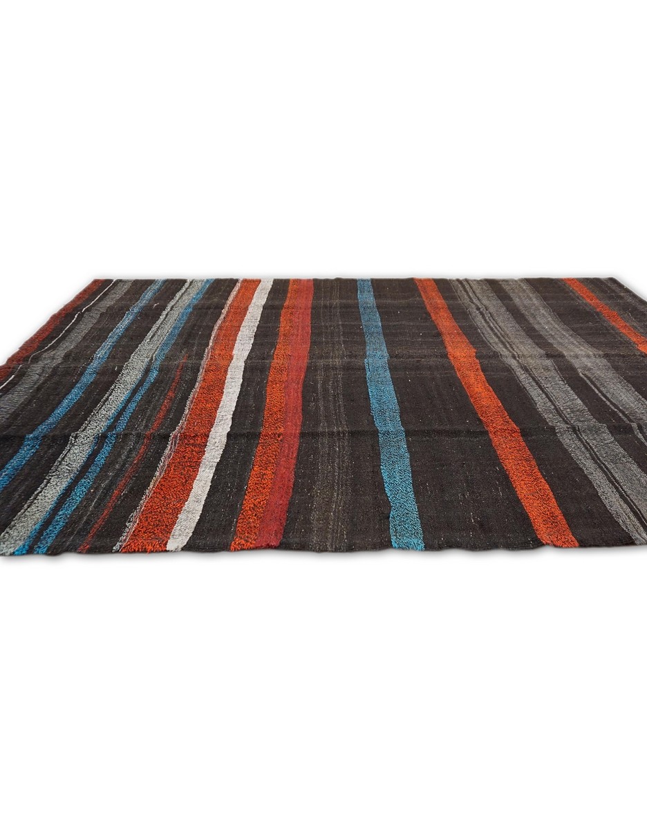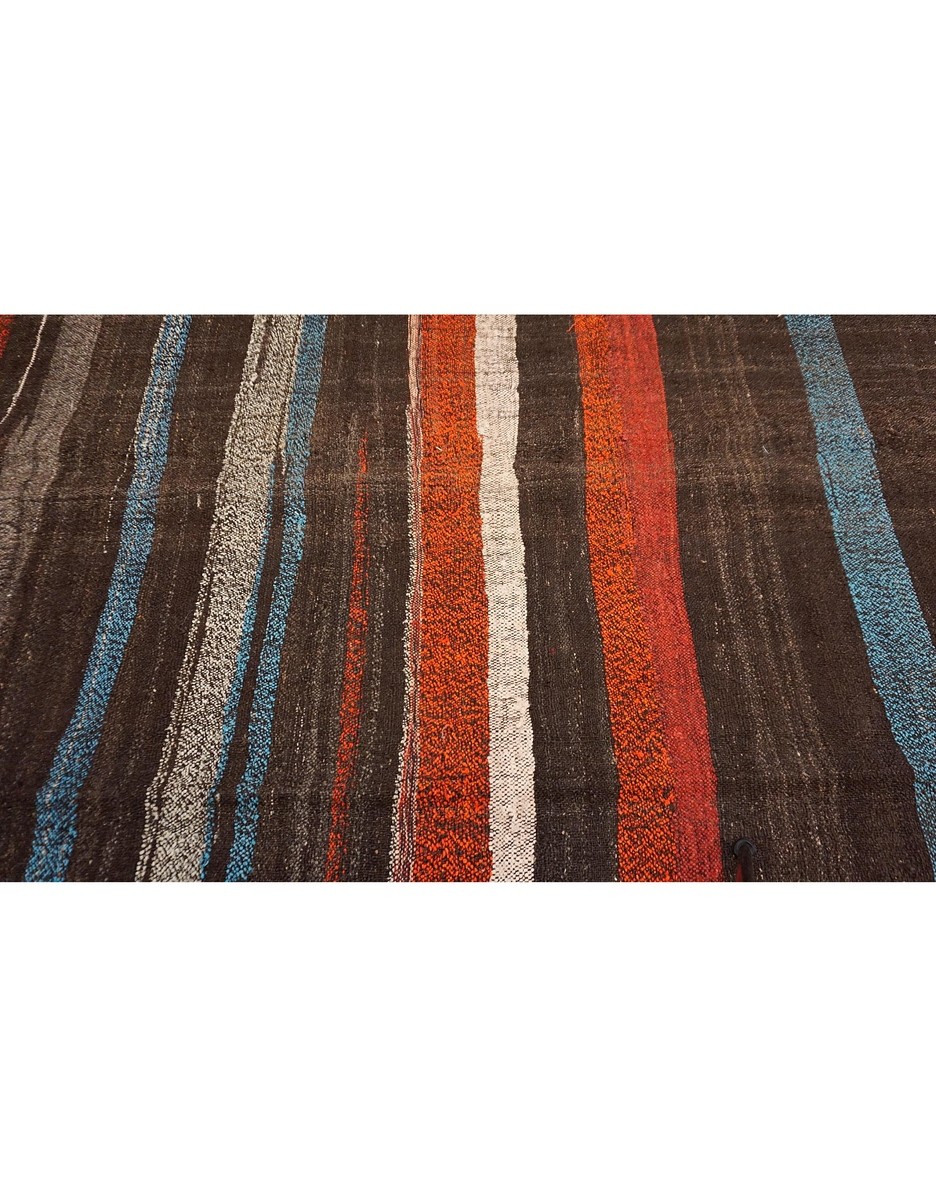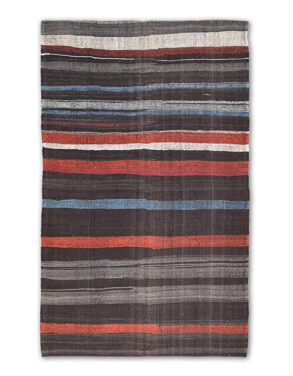 A beautiful vintage kilim is handwoven by Master Artisans using handspun goat hair in Turkey. Kilims are flat woven rugs in a technique that comes from Anatolia, parts of Iran, the Caucasus, and Turkestan. This Mazandaran style minimalist kilim offers simple designs in natural colors.