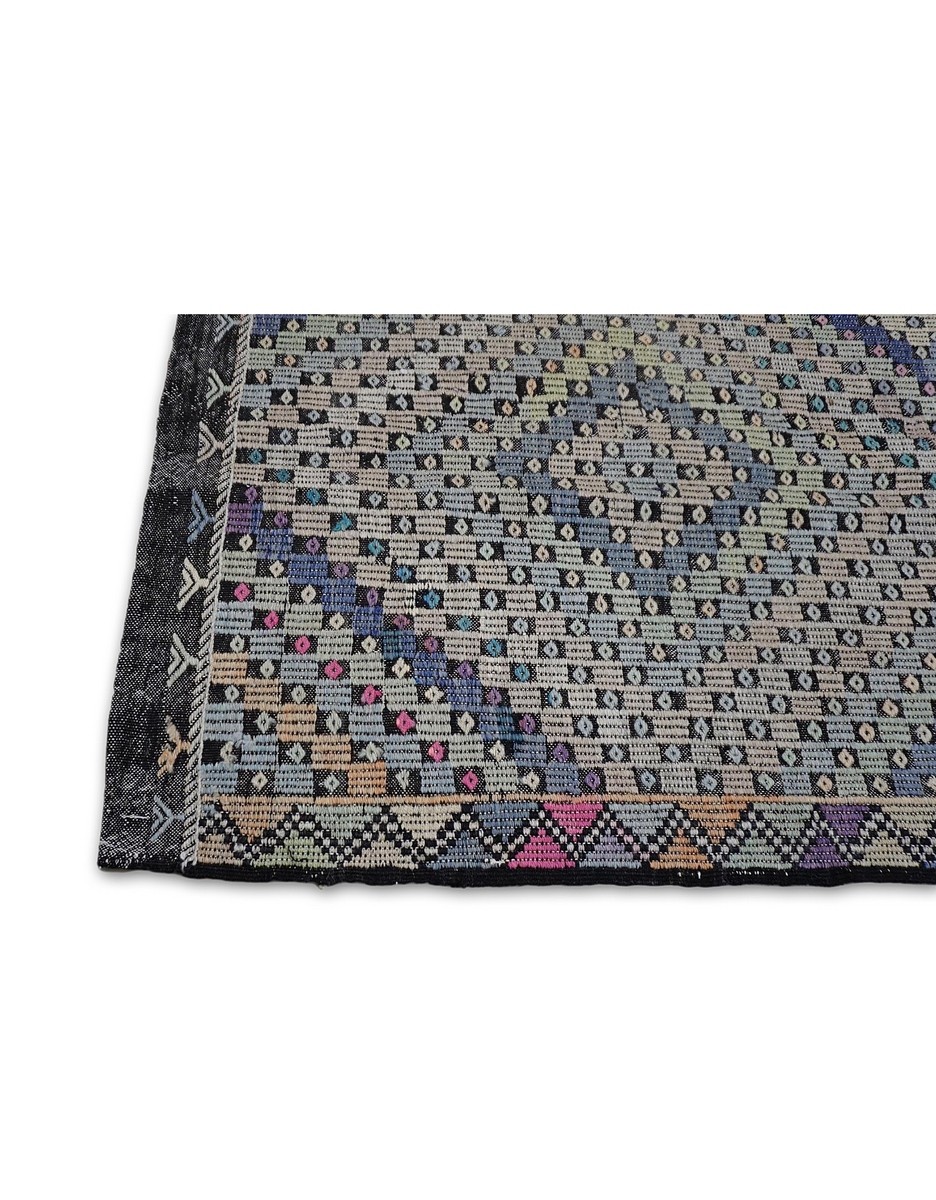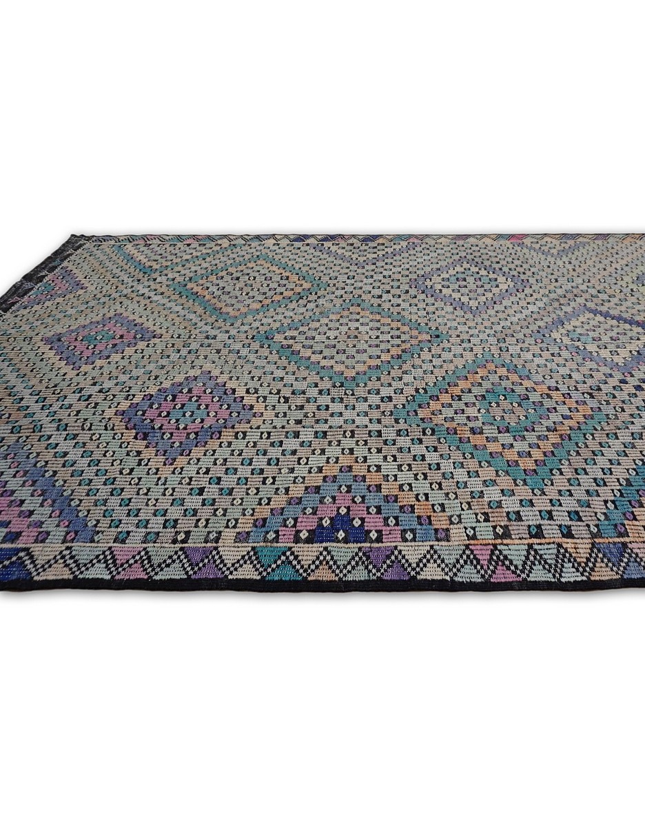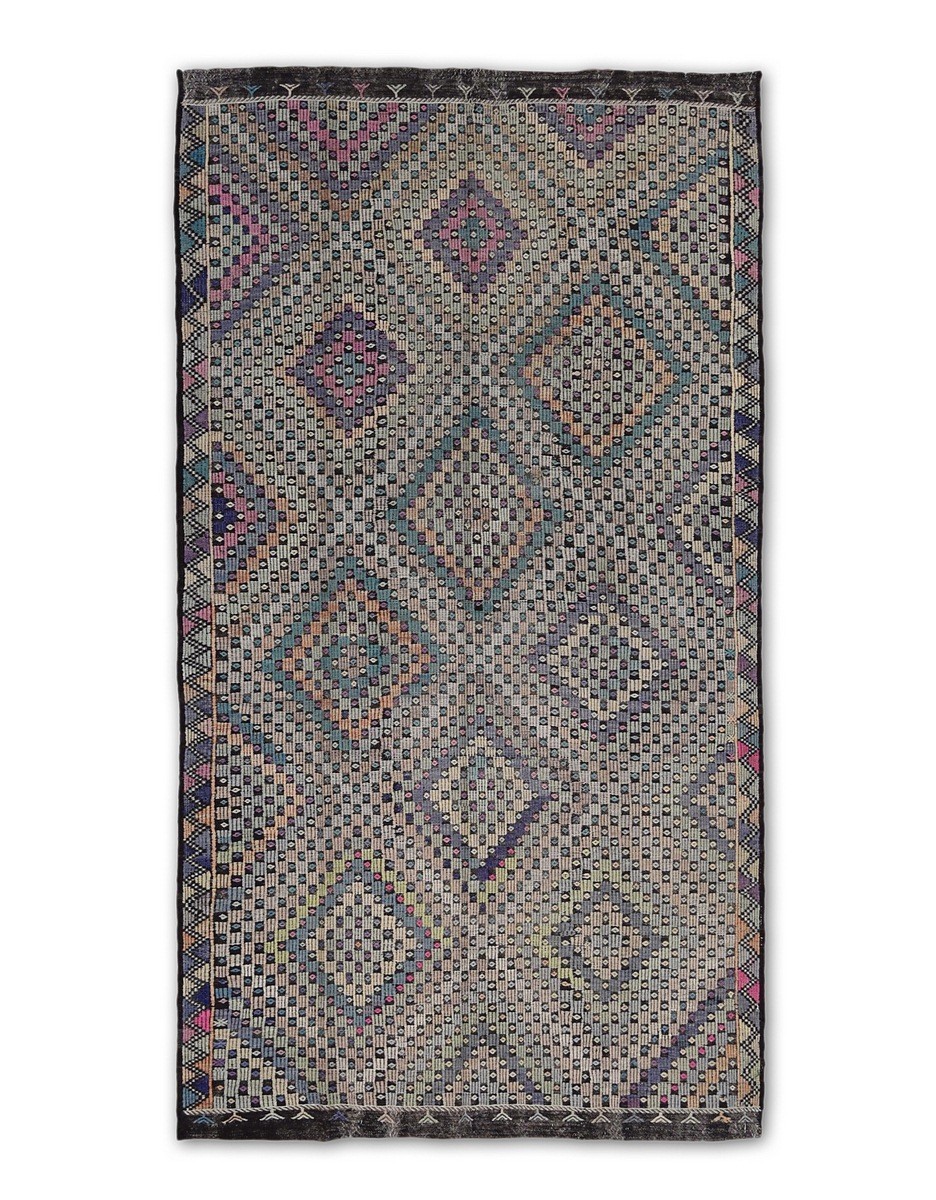 A beautiful vintage kilim is handwoven by Master Artisans using handspun goat hair in Turkey. Kilims are flat woven rugs in a technique that comes from Anatolia, parts of Iran, the Caucasus, and Turkestan. This Mazandaran style minimalist kilim offers simple designs in natural colors.
