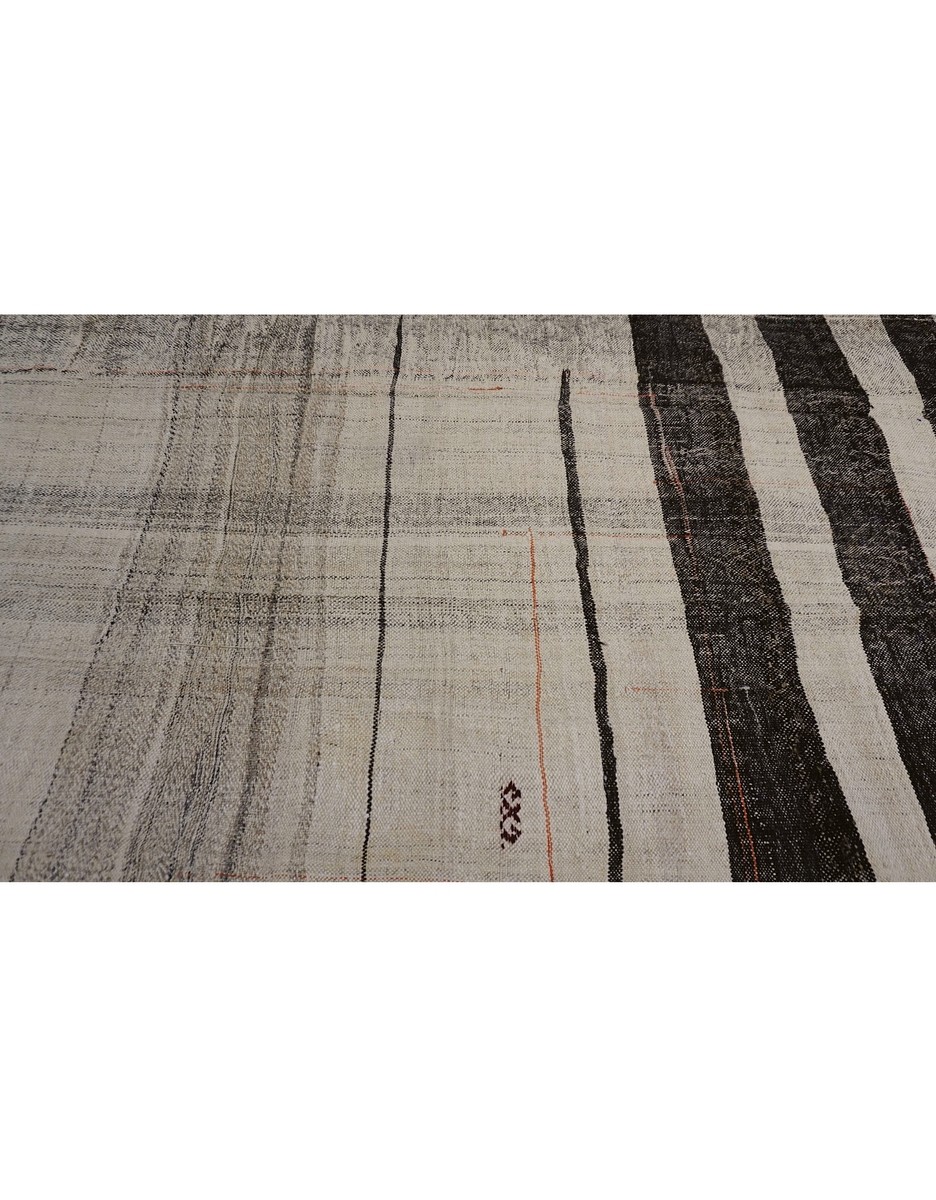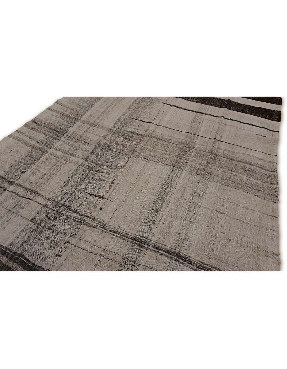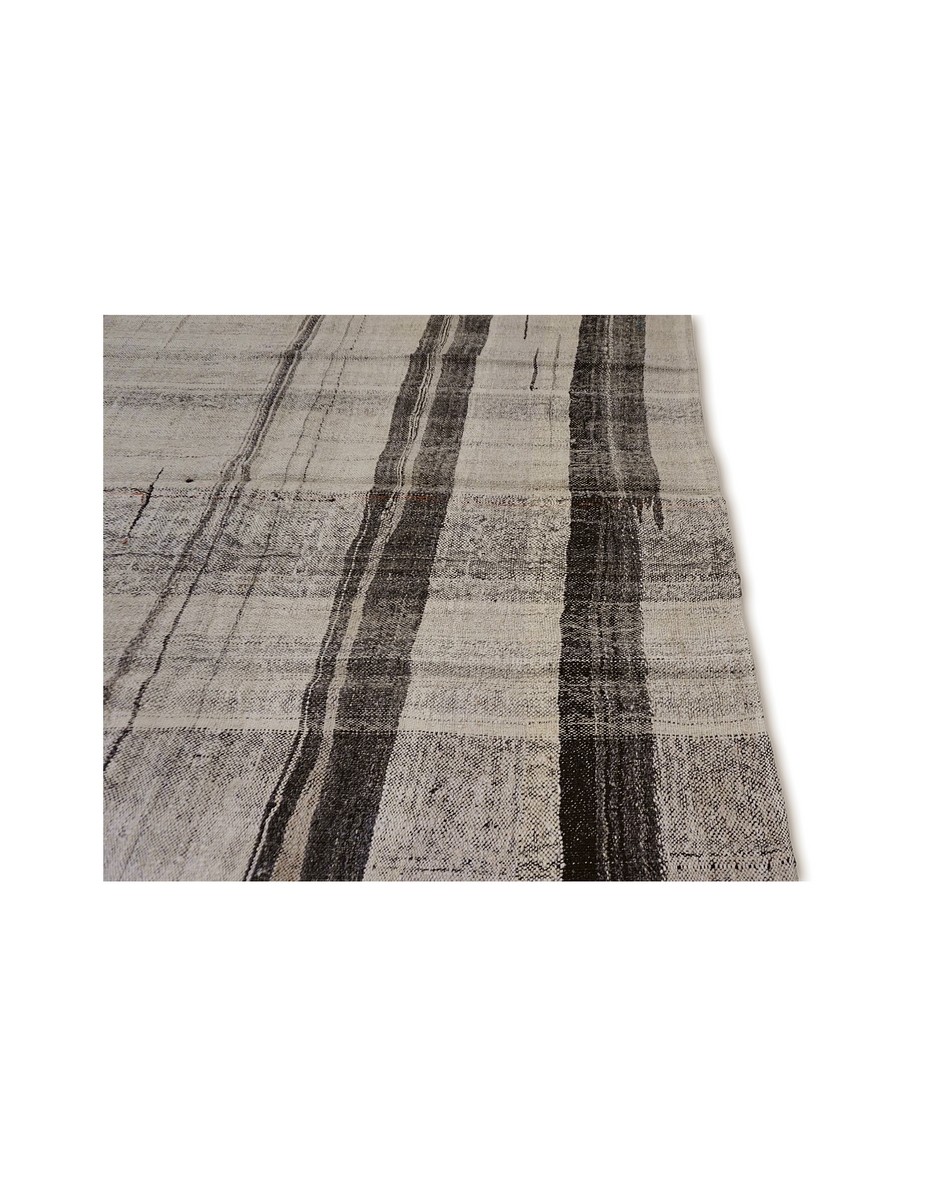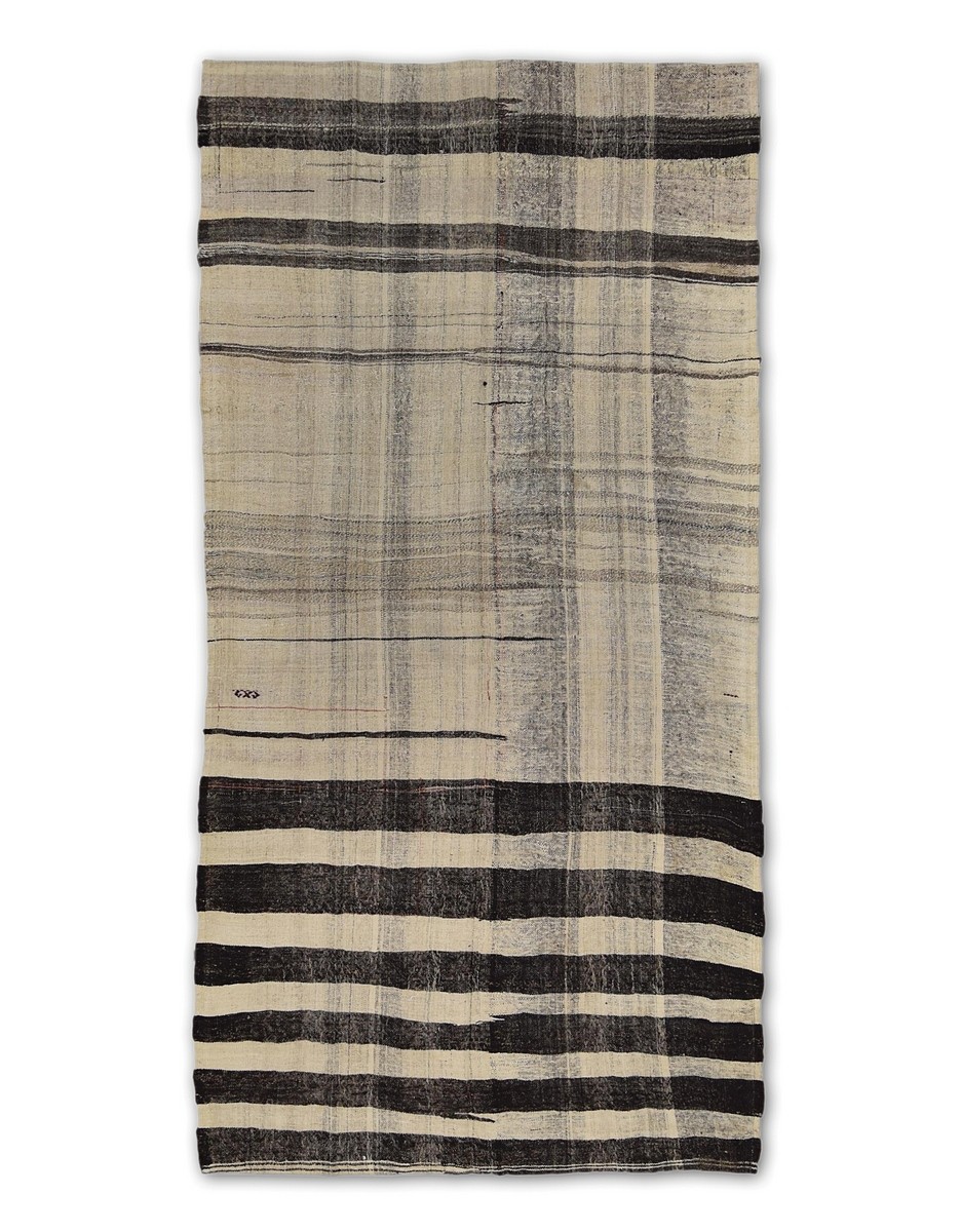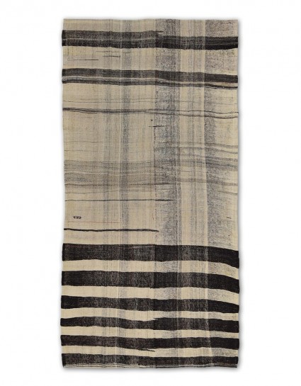 A beautiful vintage kilim is handwoven by Master Artisans using handspun goat hair in Turkey. Kilims are flat woven rugs in a technique that comes from Anatolia, parts of Iran, the Caucasus, and Turkestan. This Mazandaran style minimalist kilim offers simple designs in natural colors.