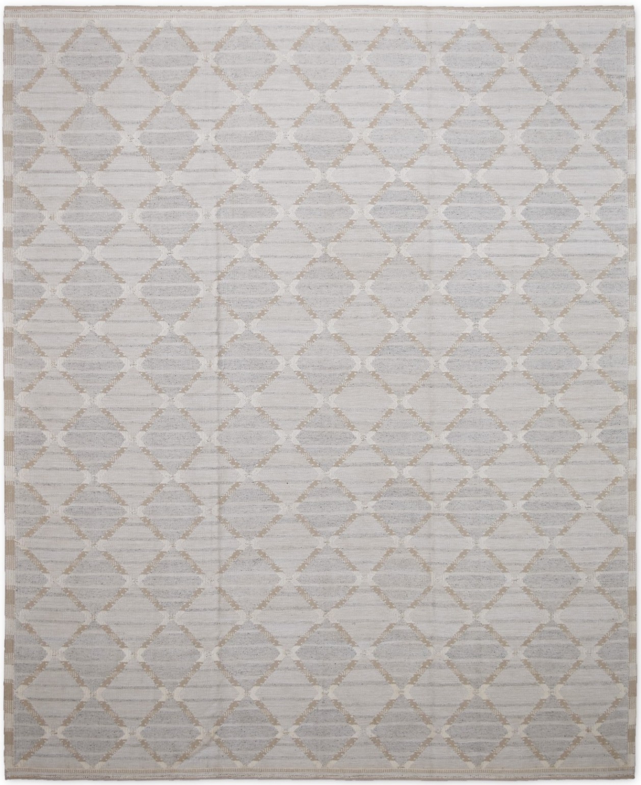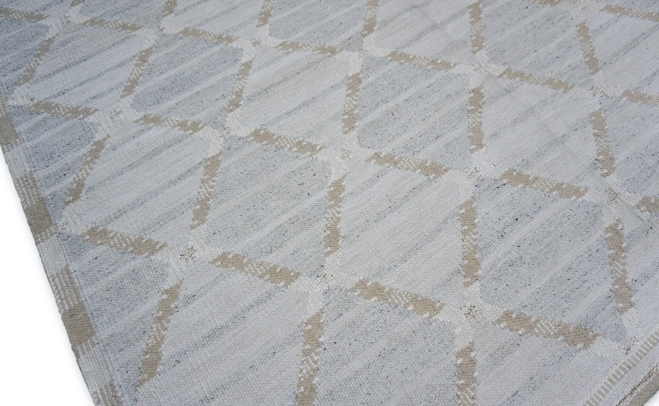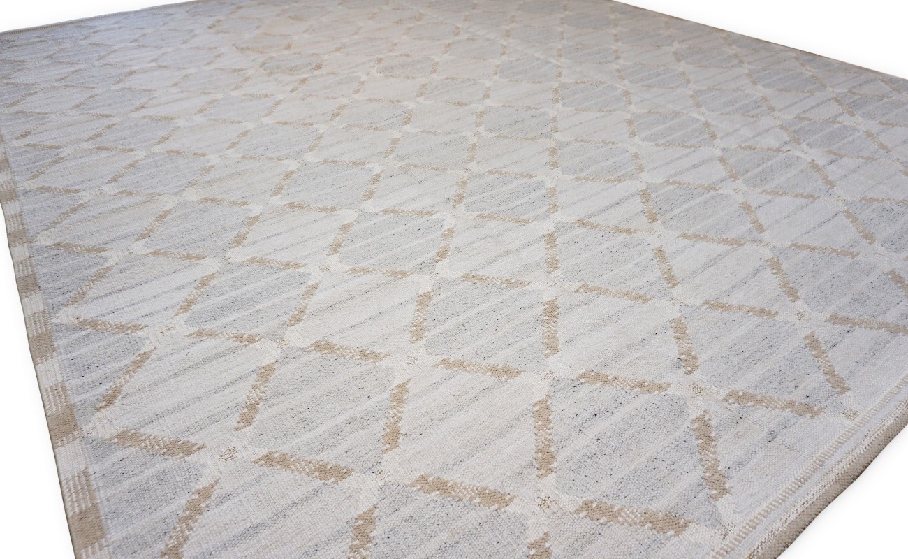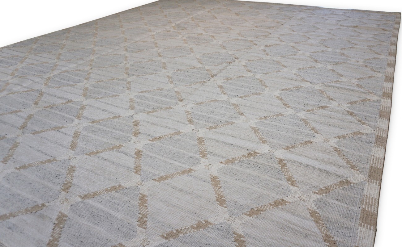 A modern hand knotted Swedish design wool rug offers a flatweave but sturdy ground.