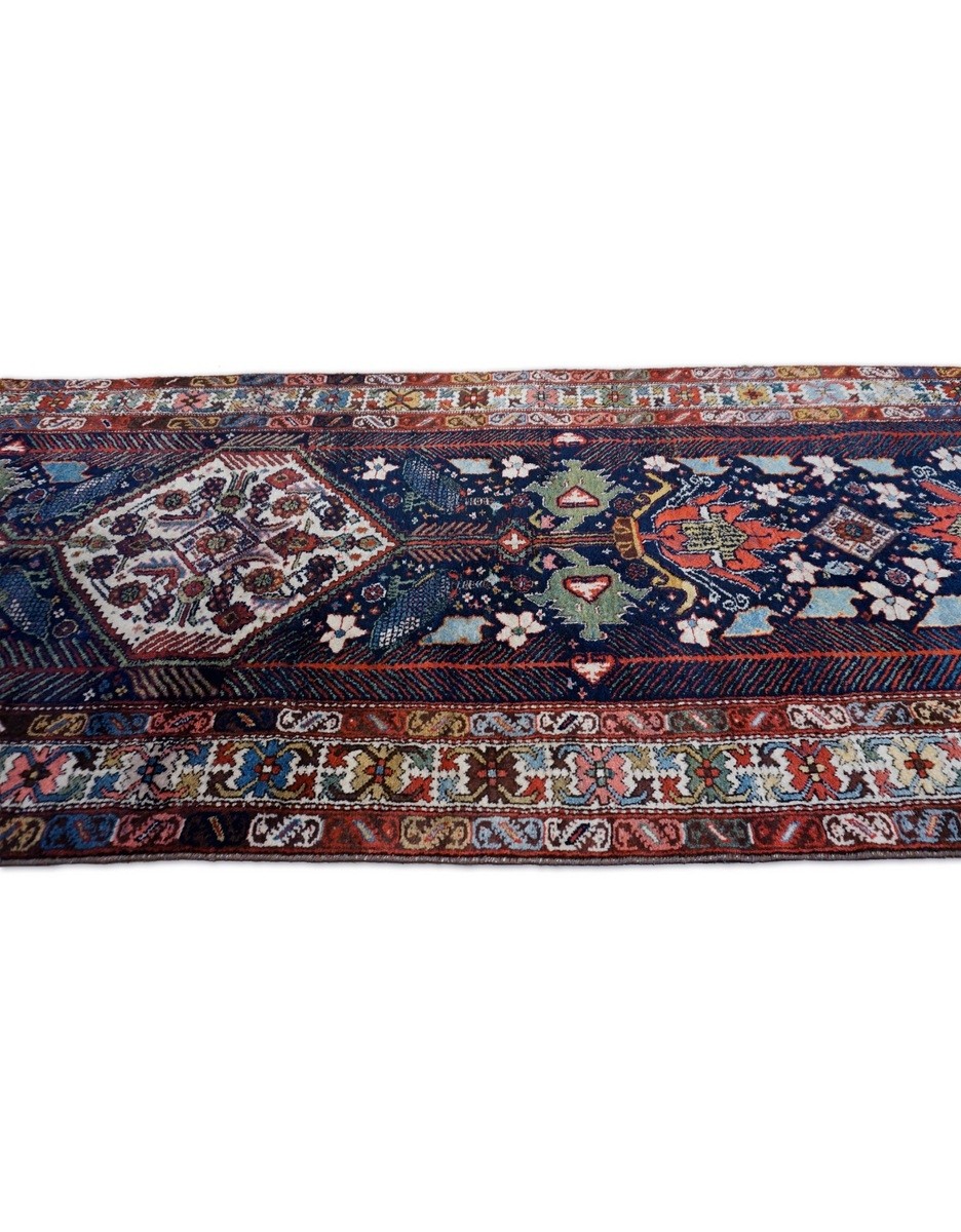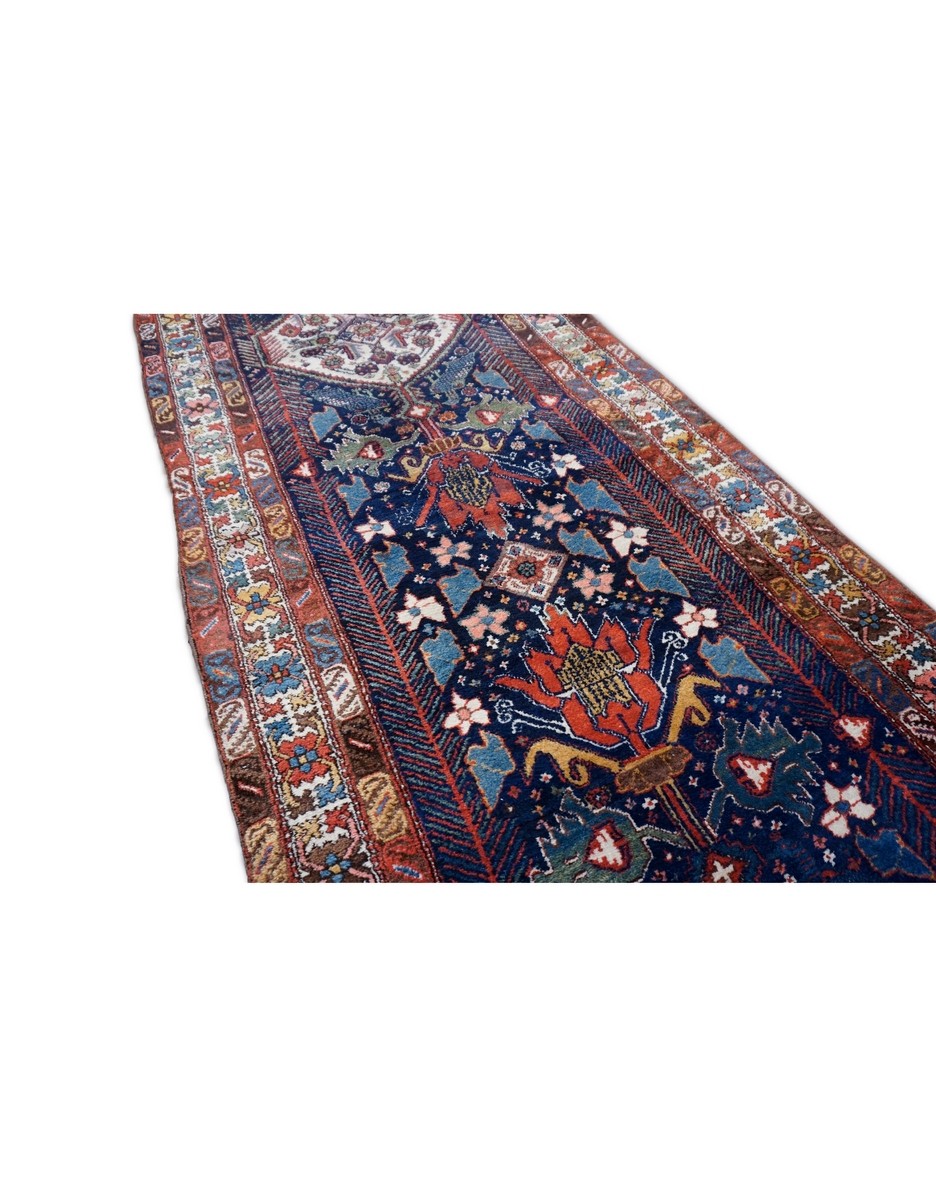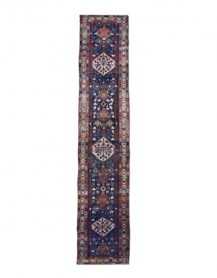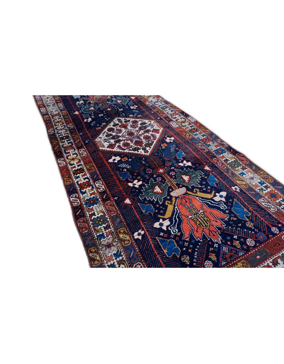 A Rare Antique Cacausian rug offers bold colors and elements.