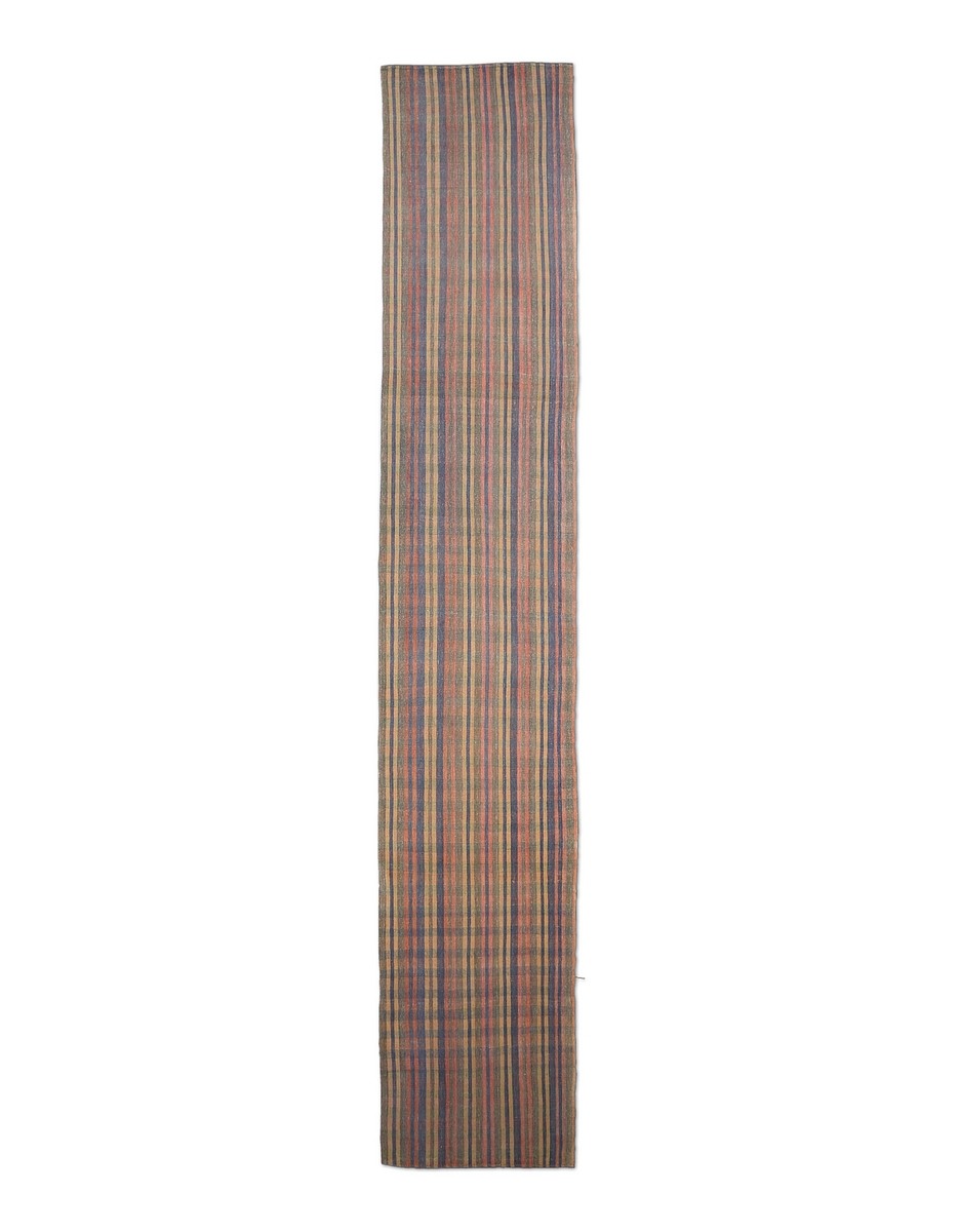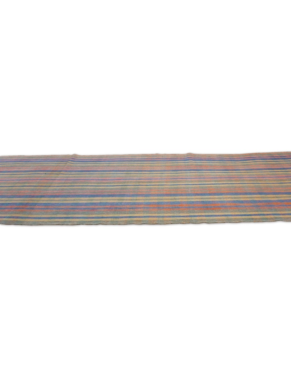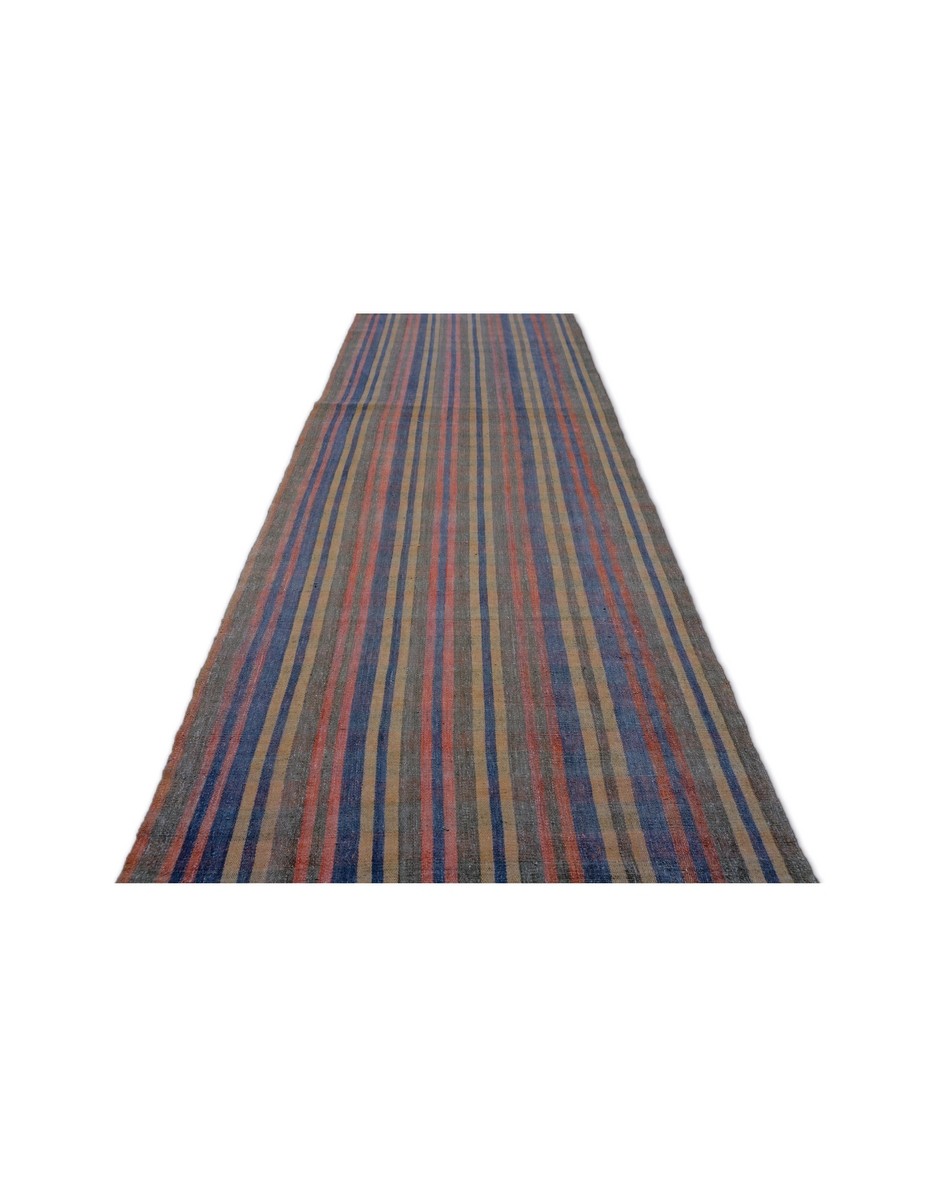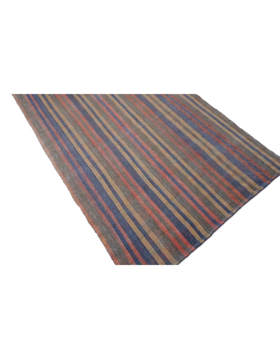 A beautiful vintage kilim is handwoven by Master Artisans using handspun goat hair in Turkey. Kilims are flat woven rugs in a technique that comes from Anatolia, parts of Iran, the Caucasus, and Turkestan. This Mazandaran style minimalist kilim offers simple designs in natural colors.