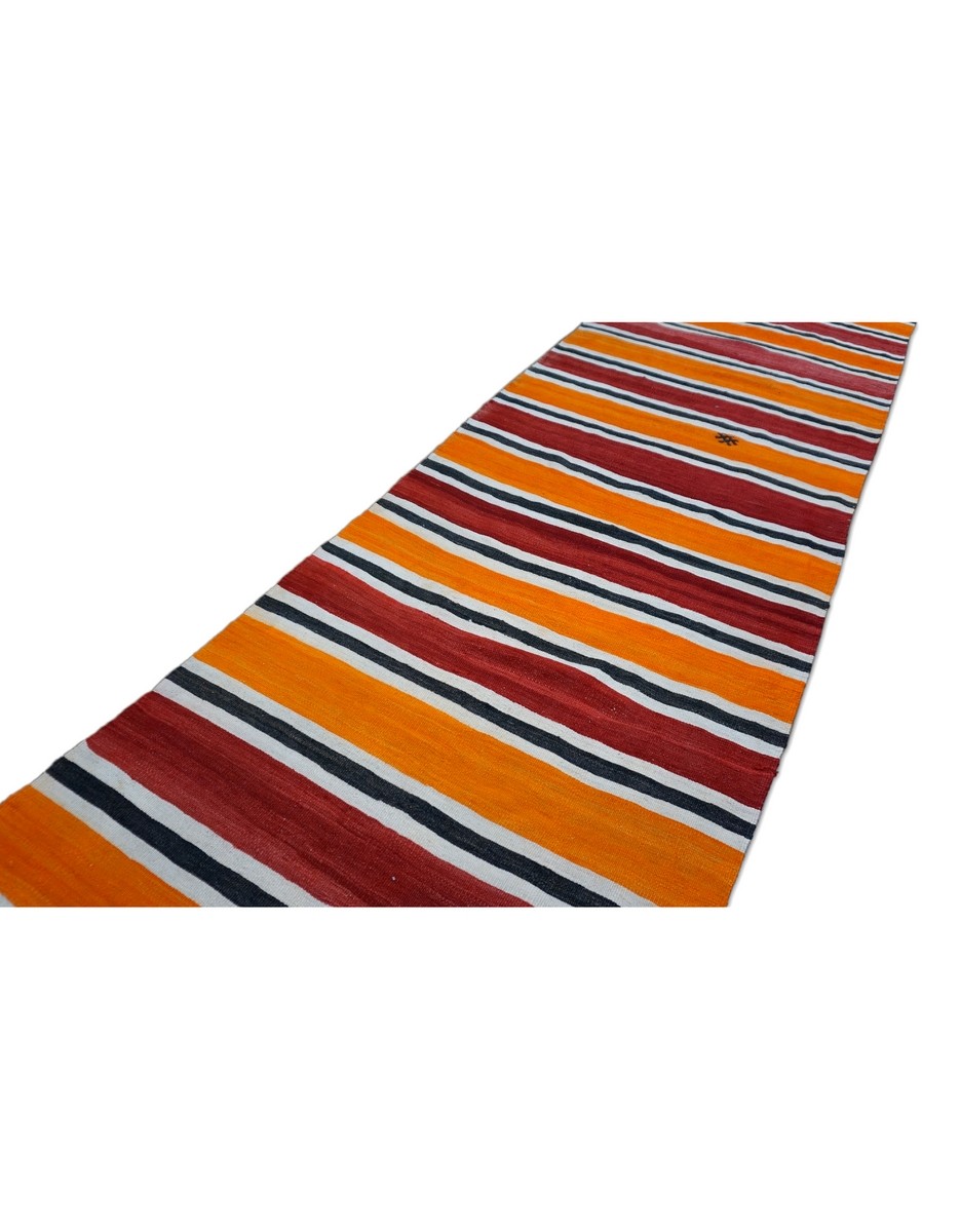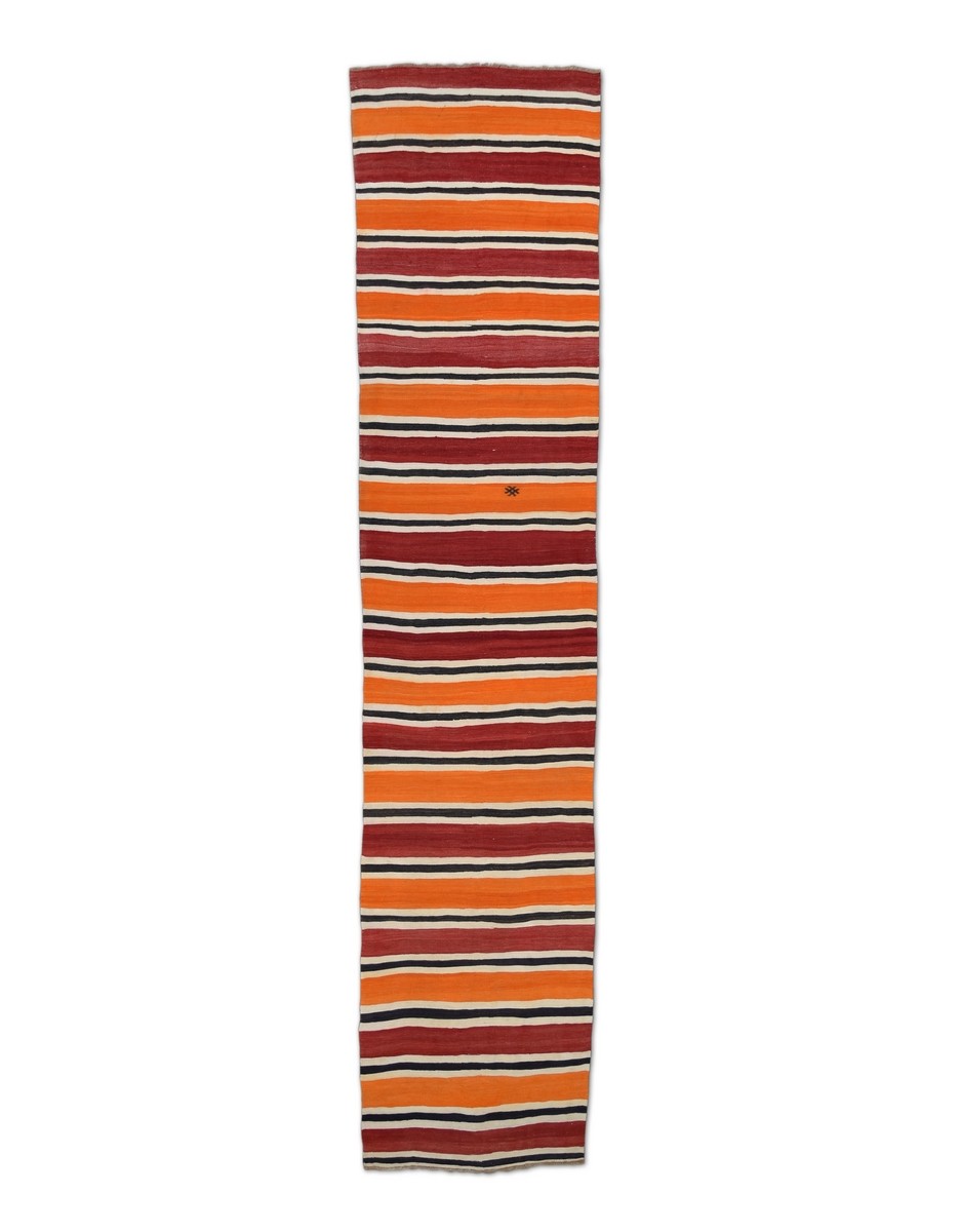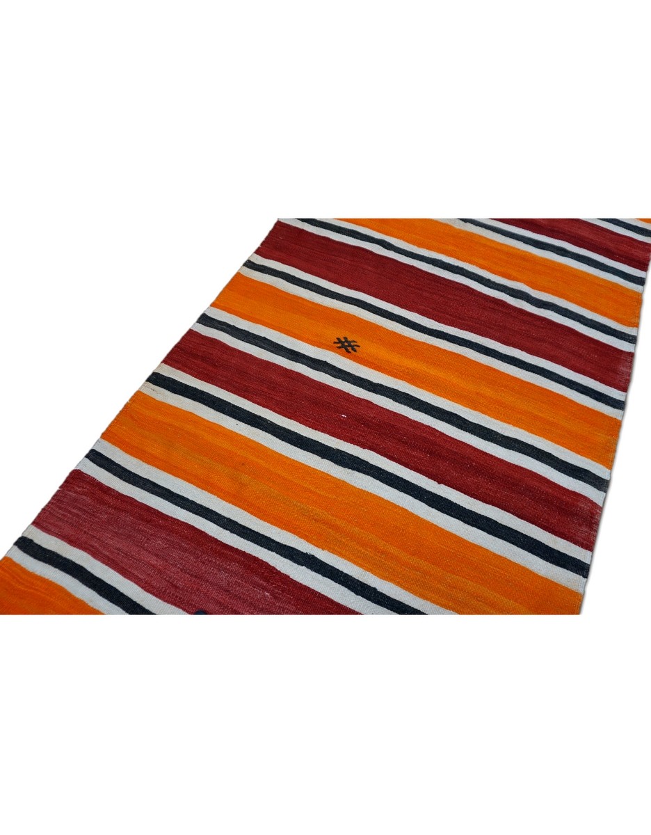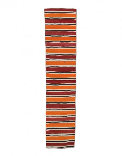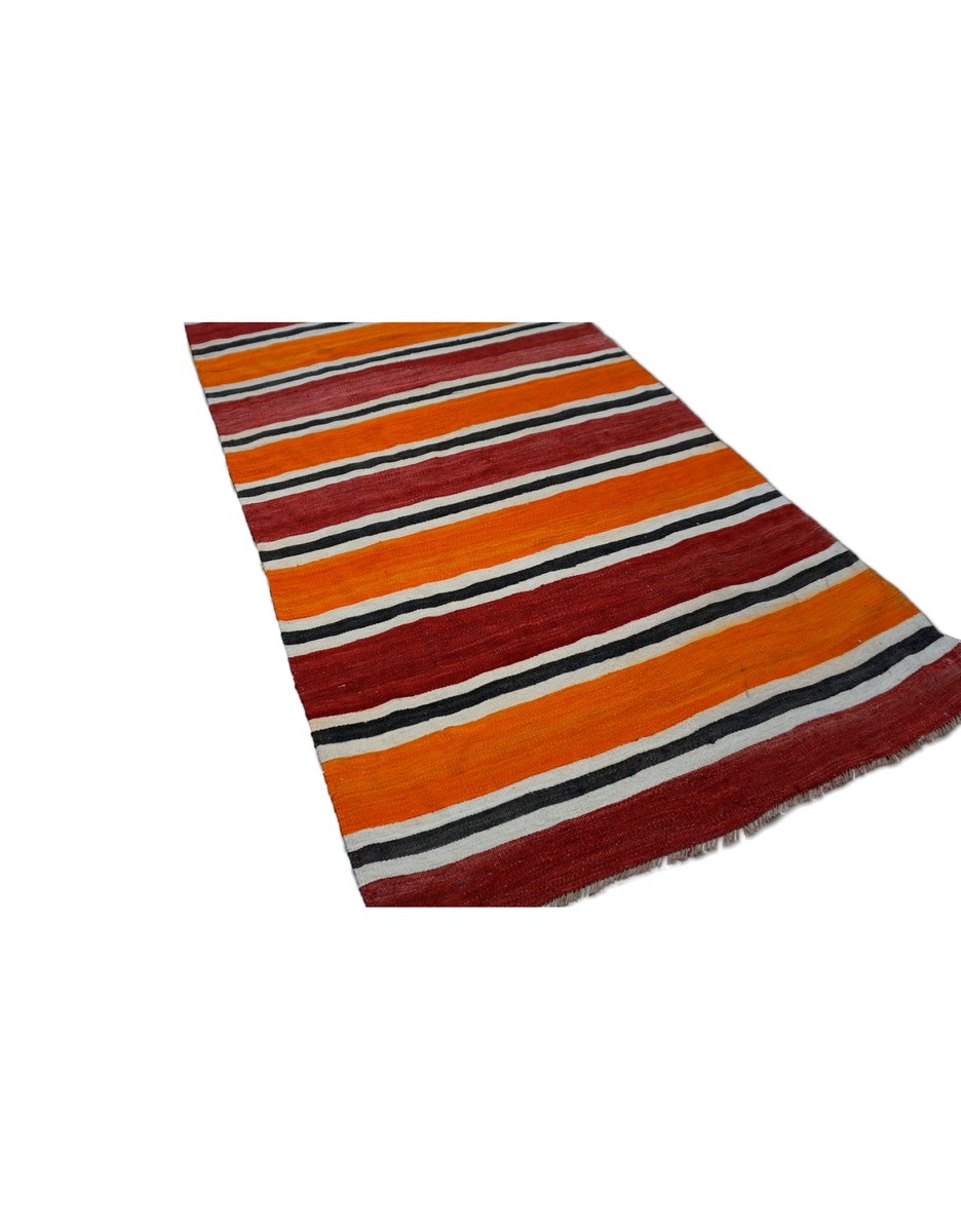 A beautiful vintage kilim is handwoven by Master Artisans using handspun goat hair in Turkey. Kilims are flat woven rugs in a technique that comes from Anatolia, parts of Iran, the Caucasus, and Turkestan. This Mazandaran style minimalist kilim offers simple designs in natural colors.
