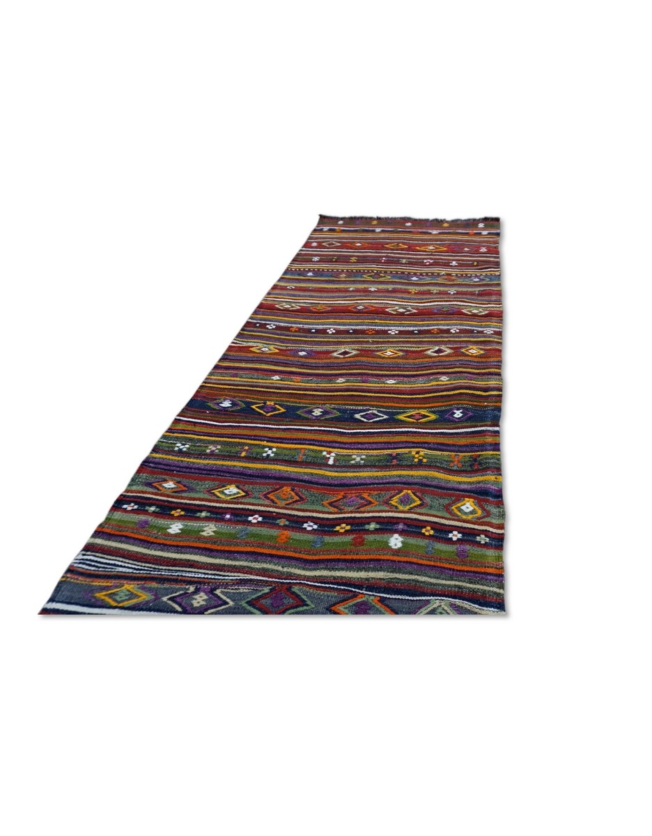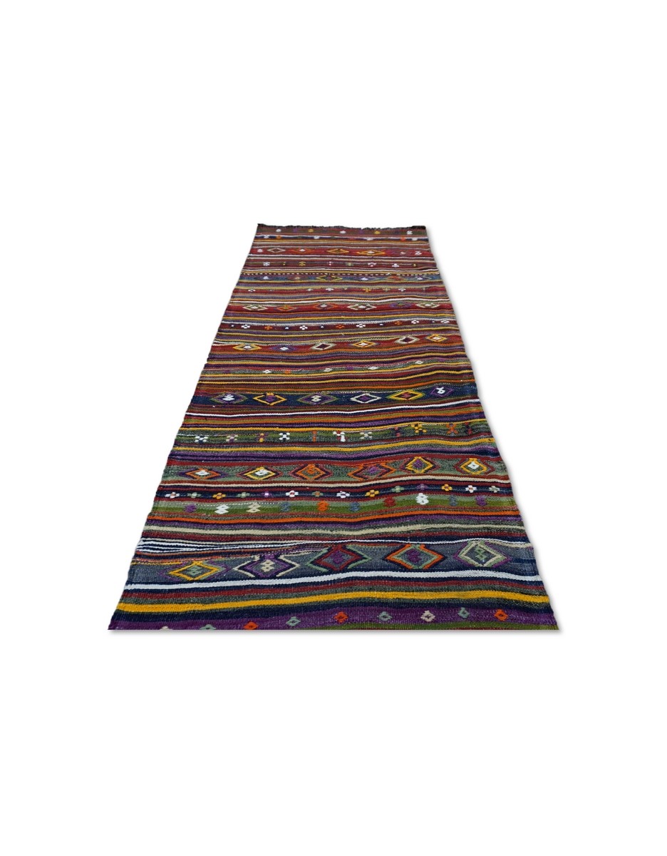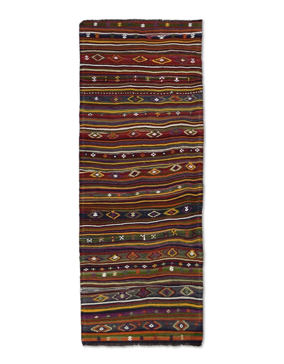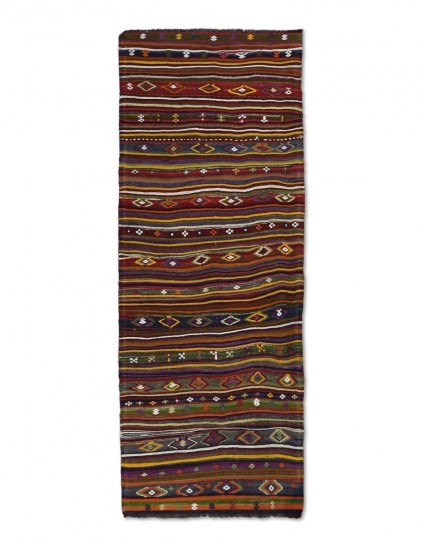 A beautiful vintage kilim is handwoven by Master Artisans using handspun goat hair in Turkey. Kilims are flat woven rugs in a technique that comes from Anatolia, parts of Iran, the Caucasus, and Turkestan. This Mazandaran style minimalist kilim offers simple designs in natural colors.