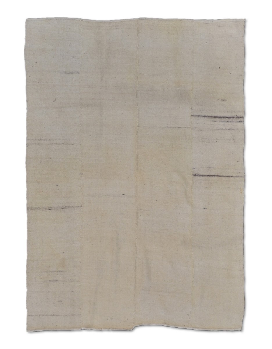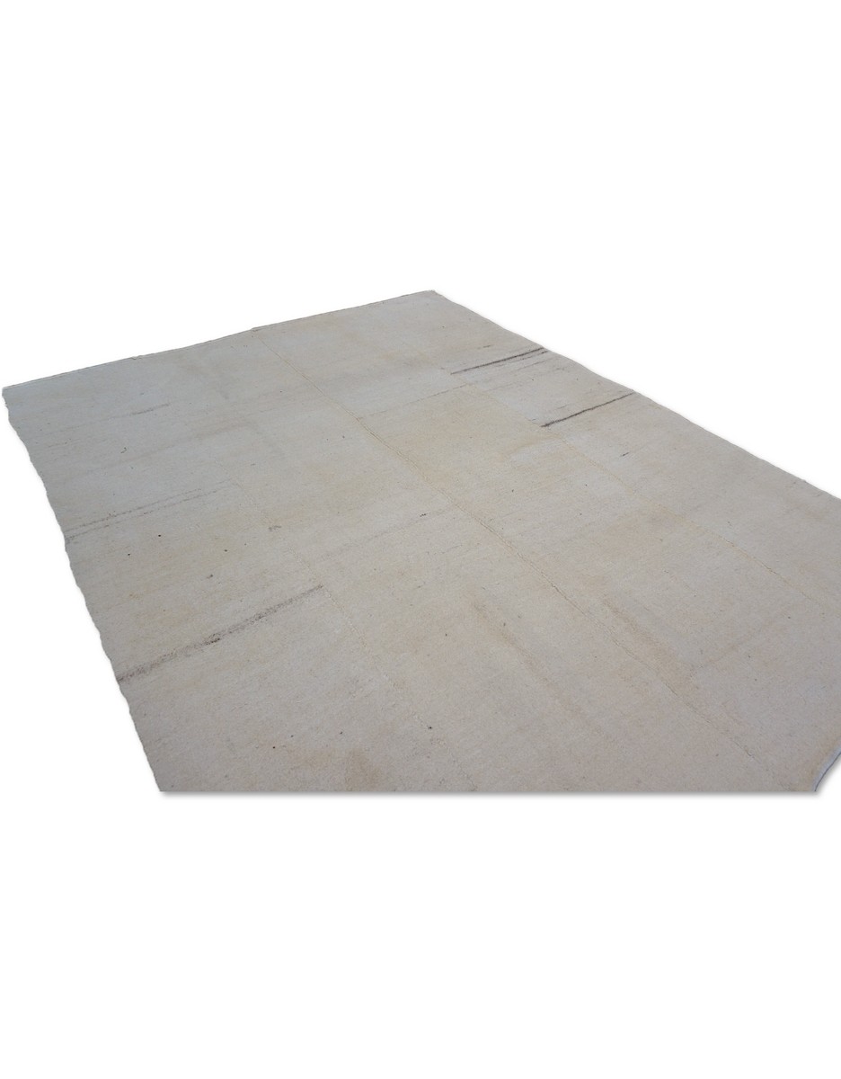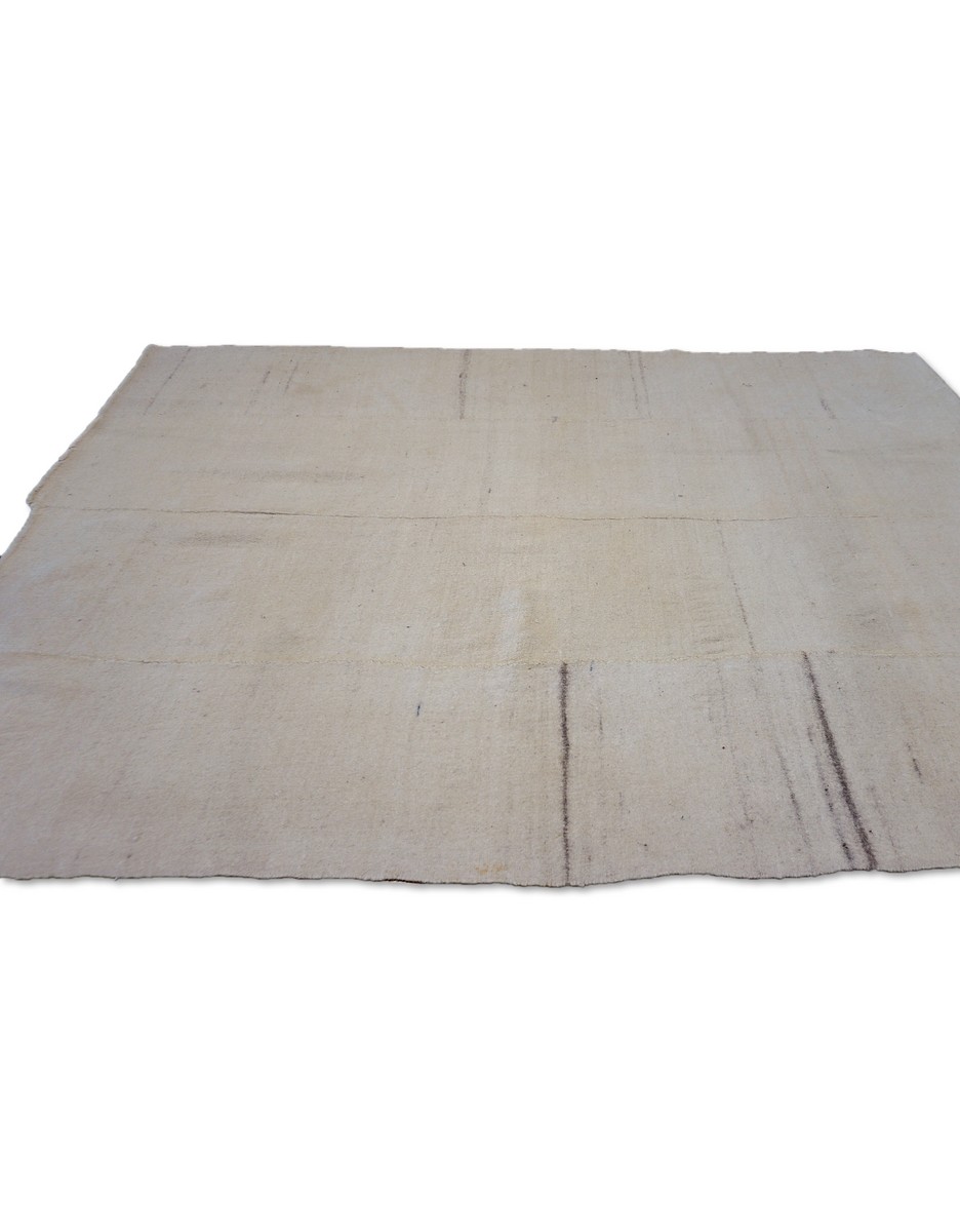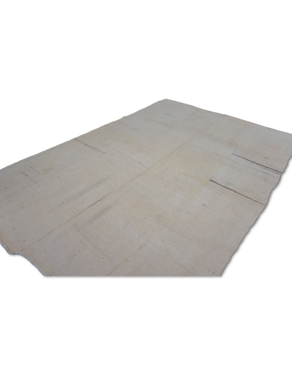 A beautiful vintage kilim is handwoven by Master Artisans using handspun wool in Turkey. Kilims are flat woven rugs in a technique that comes from Anatolia, parts of Iran, the Caucasus, and Turkestan. This Mazandaran style minimalist kilim offers simple designs in natural colors.