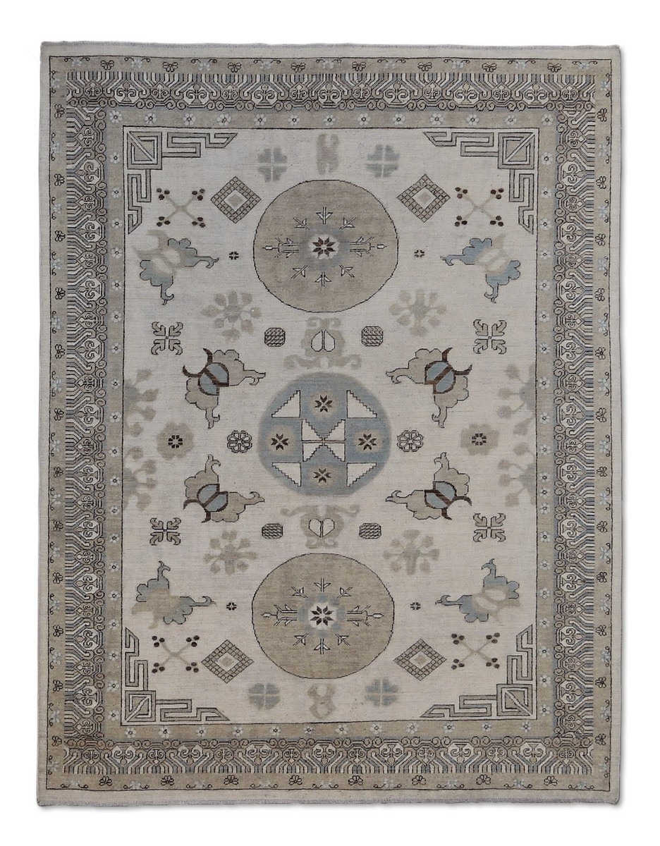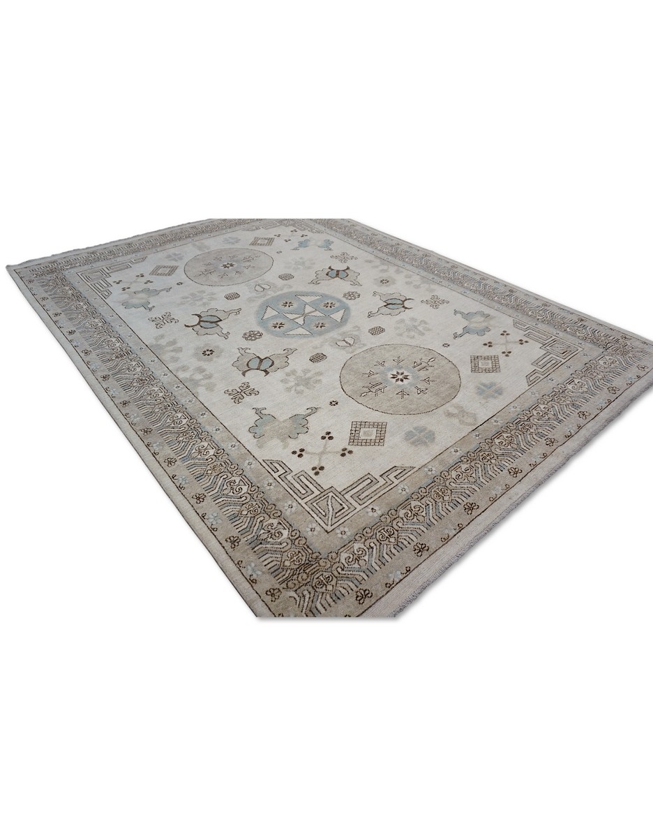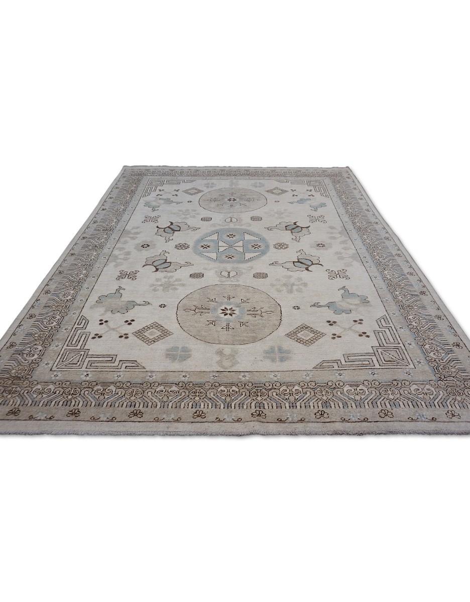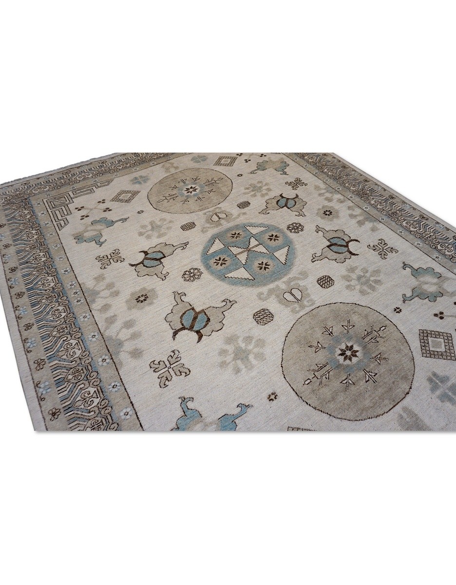 A beautiful Persian Sultanabad design using handspun high altitude wool dyed in subtle colors. Hand Knotted by master weavers of Afghanistan & painstakingly finishing process done by Pakistani Artisans makes this rug a masterpiece & takes us back to the late 19th-century era.