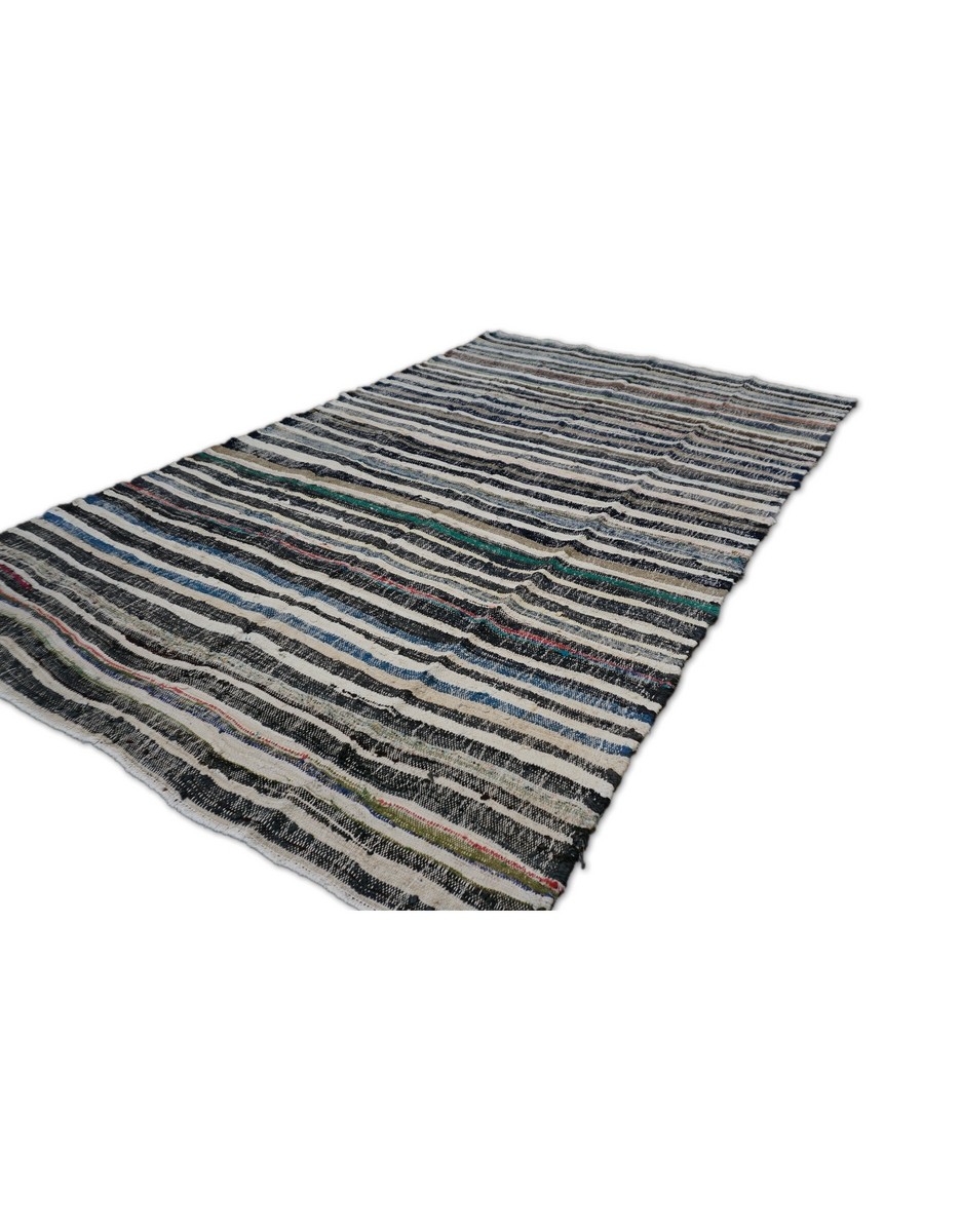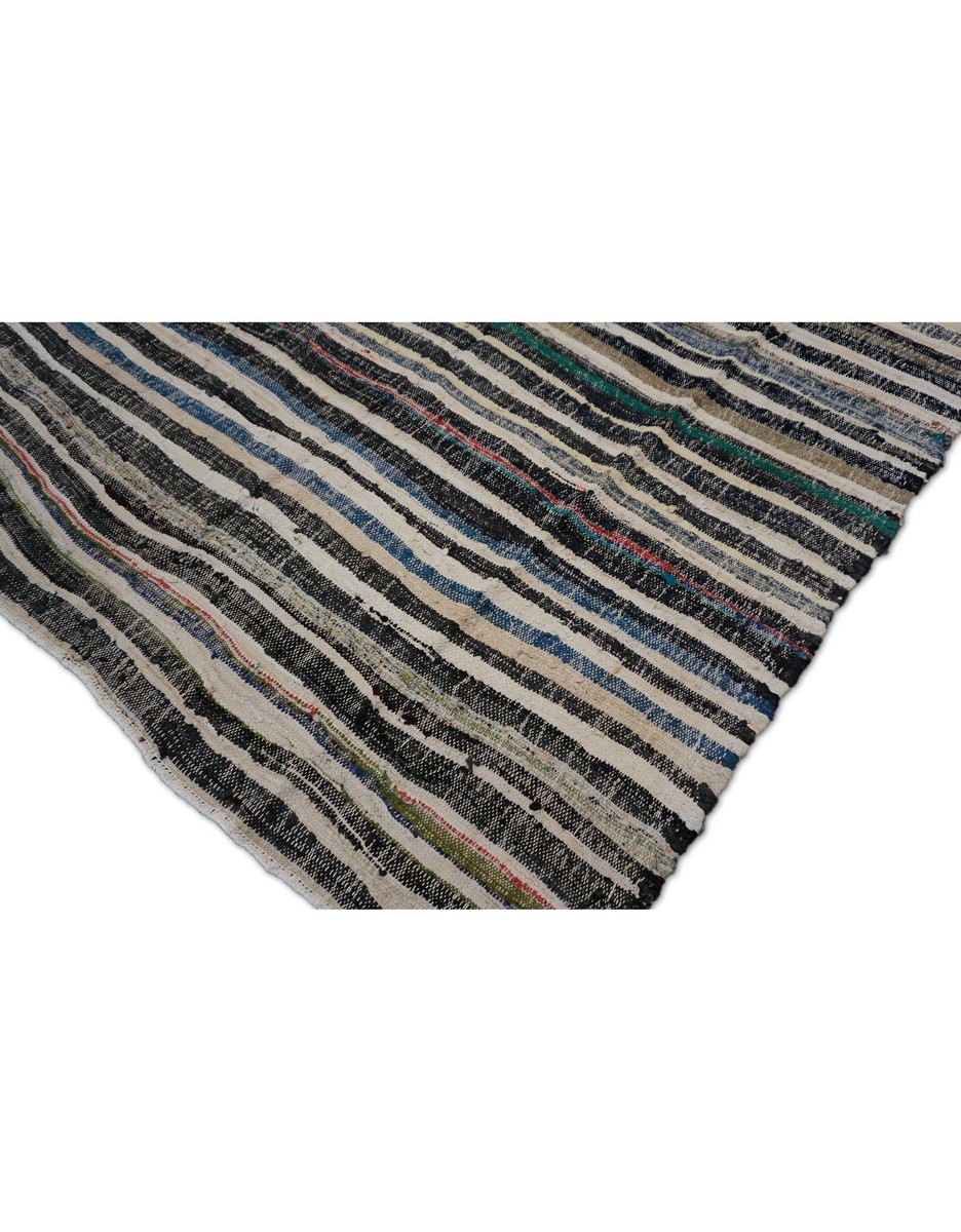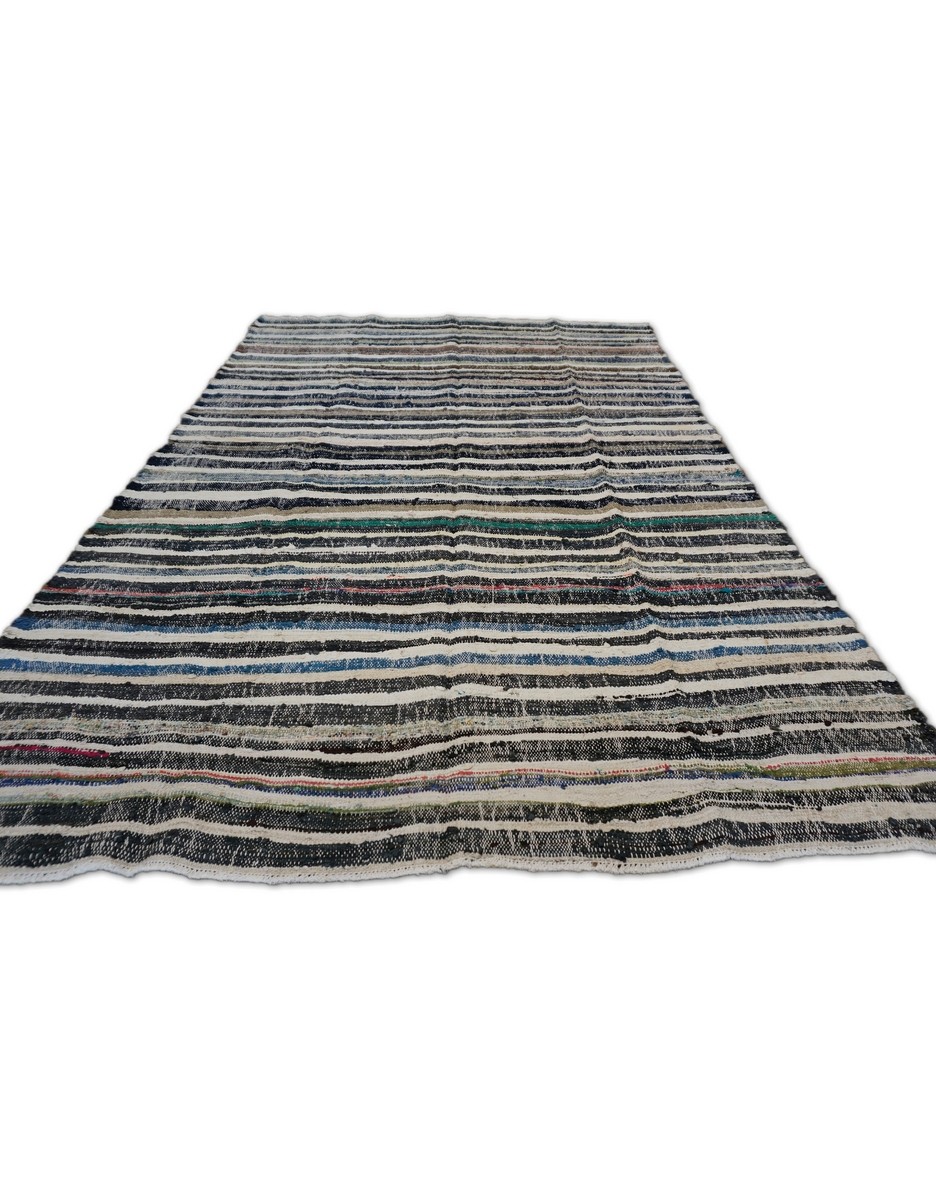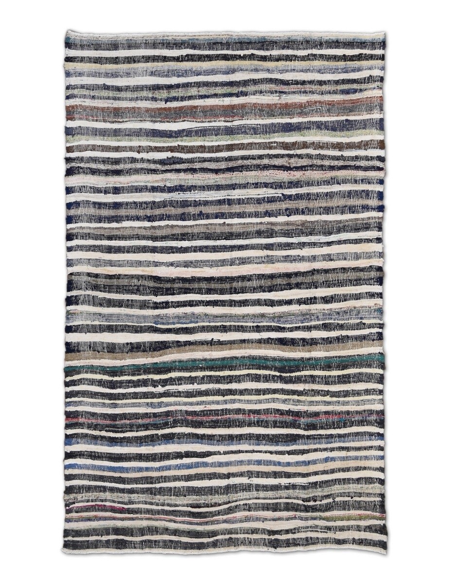 A beautiful vintage kilim is handwoven by Master Artisans using handspun wool in Turkey. Kilims are flat woven rugs in a technique that comes from Anatolia, parts of Iran, the Caucasus, and Turkestan. This Mazandaran style minimalist kilim offers simple designs in natural colors.