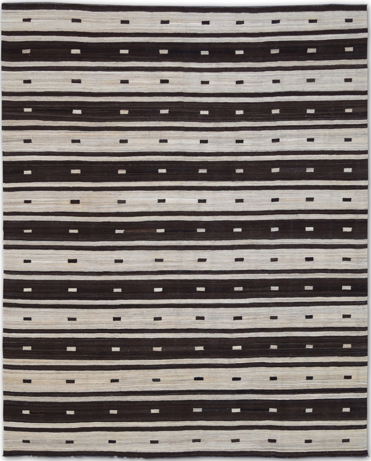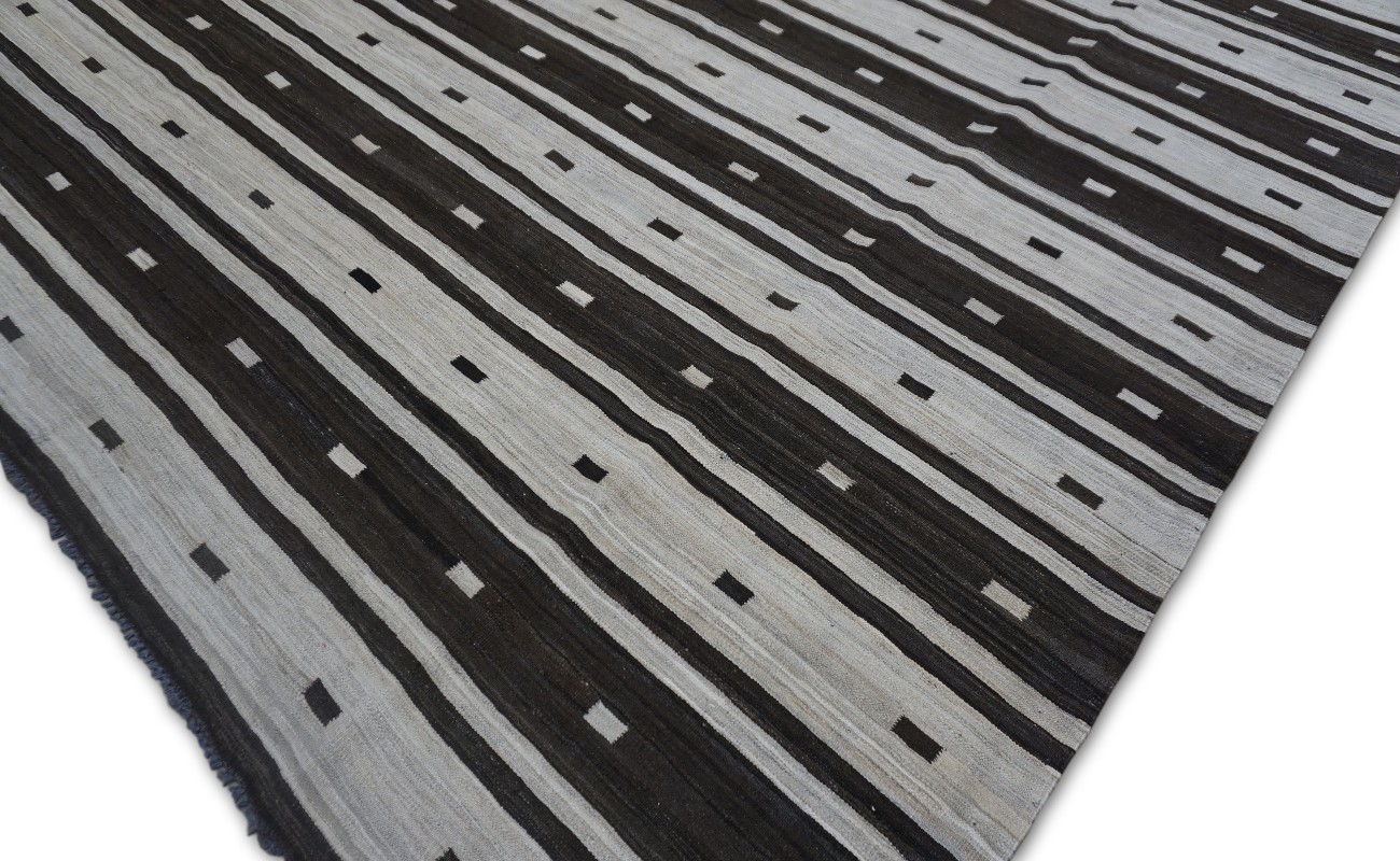 Kilims are flat woven rugs in a technique that comes from Anatolia, parts of Iran, the Caucasus, and Turkey. This Turkish style modern kilim rug is handwoven in Wool.