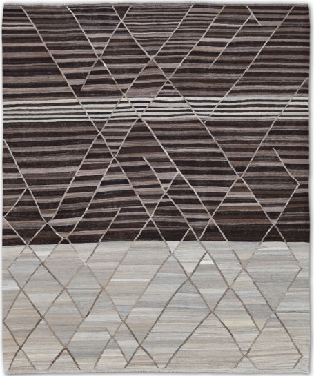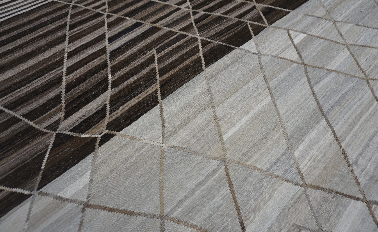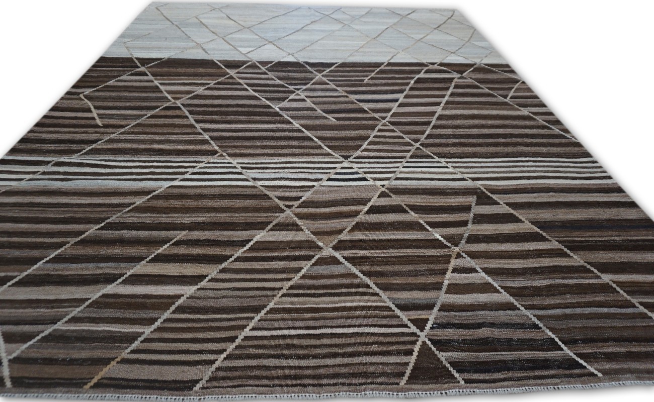 Kilims are flat woven rugs in a technique that comes from Anatolia, parts of Iran, the Caucasus, and Turkey. This Turkish style modern kilim rug is handwoven in Wool.