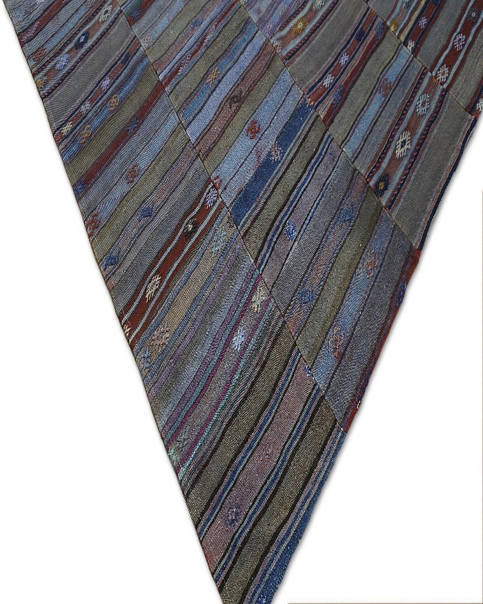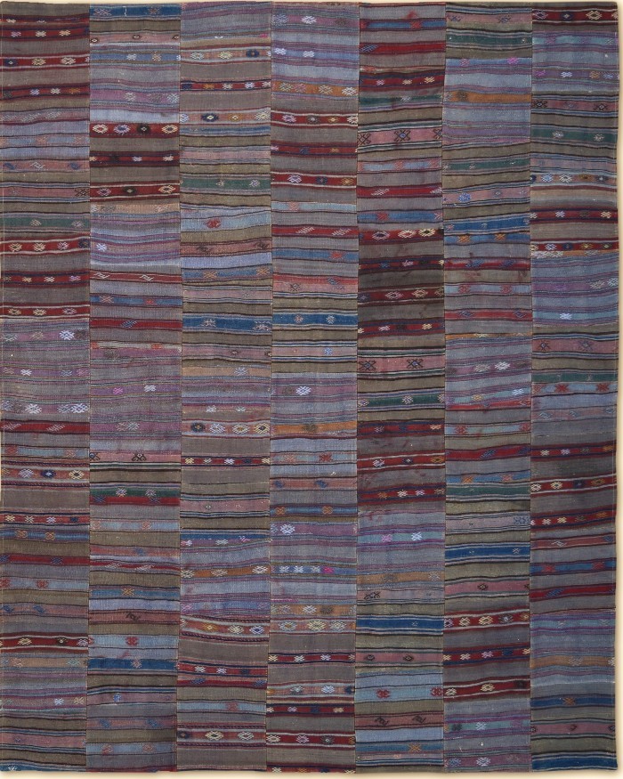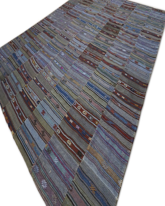 A beautiful vintage kilim is handwoven by Master Artisans using handspun Wool in Turkey. Kilims are flat woven rugs in a technique that comes from Anatolia, parts of Iran, the Caucasus, and Turkestan. This Mazandaran style minimalist kilim offers simple designs in natural colors.