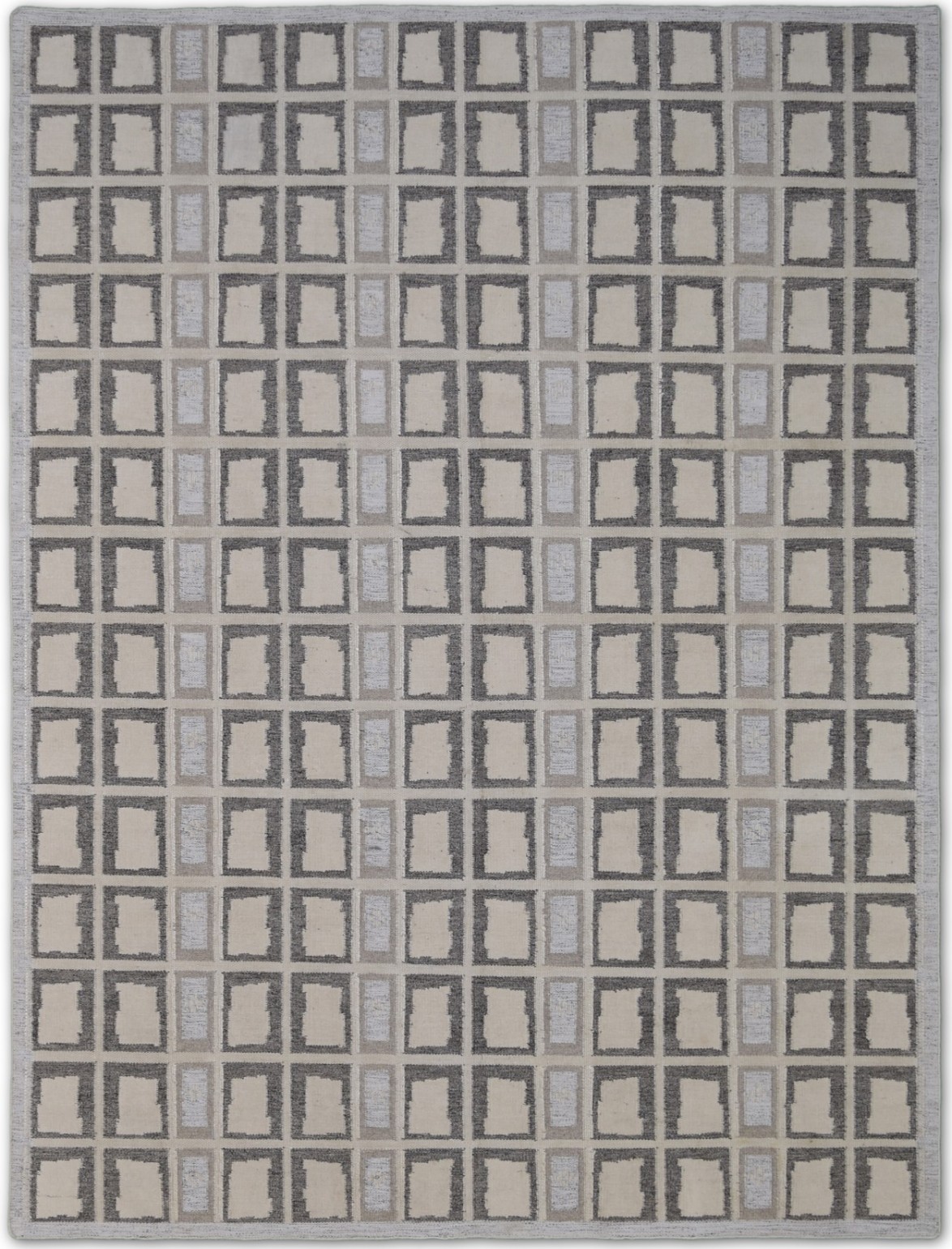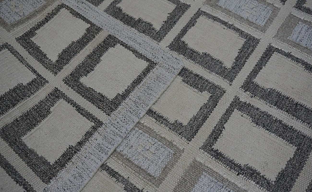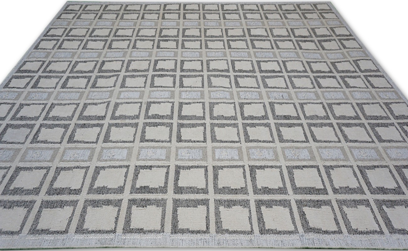 A modern hand knotted Swedish design wool rug offers a flatweave but sturdy ground.