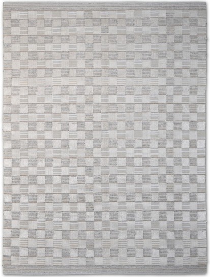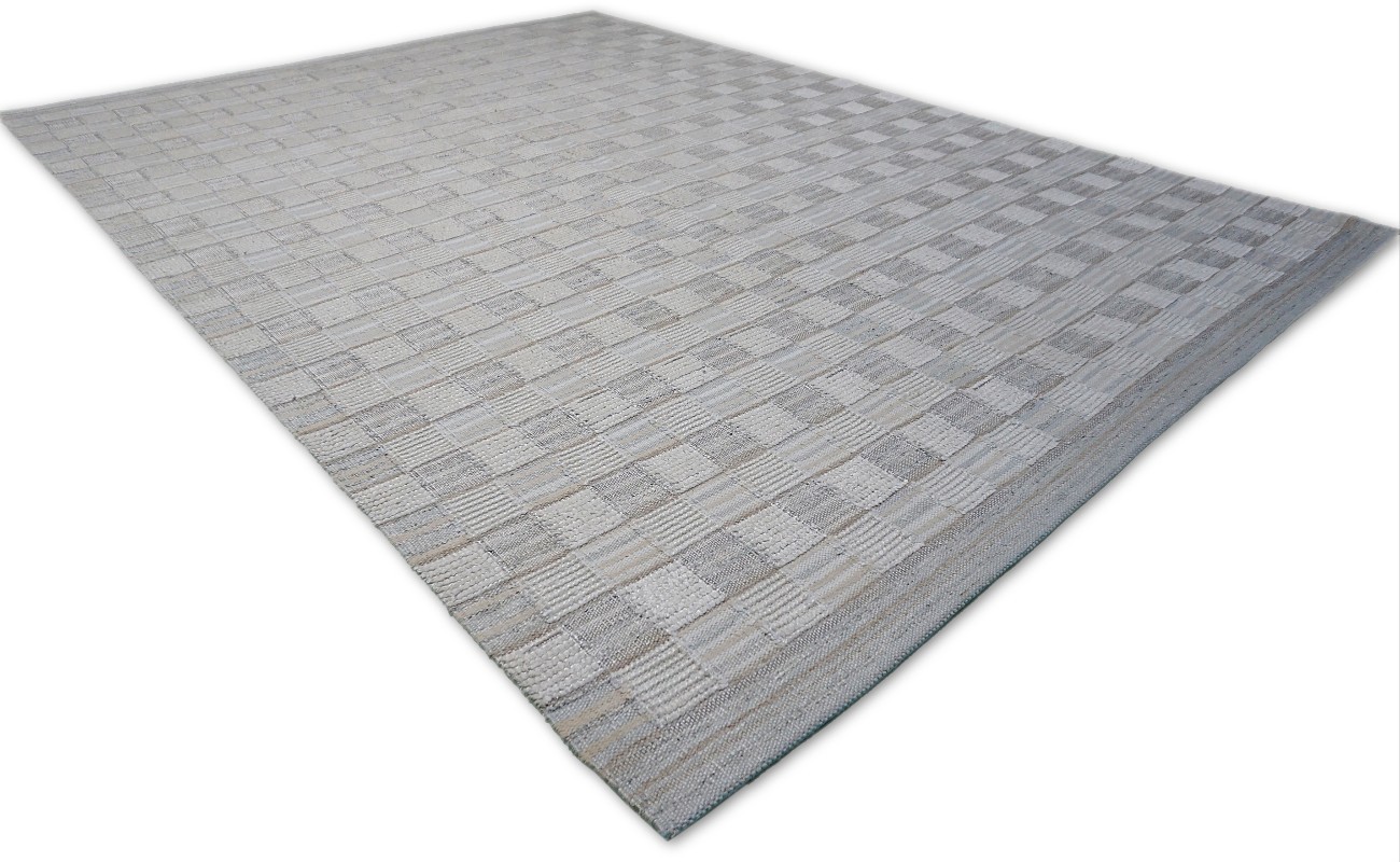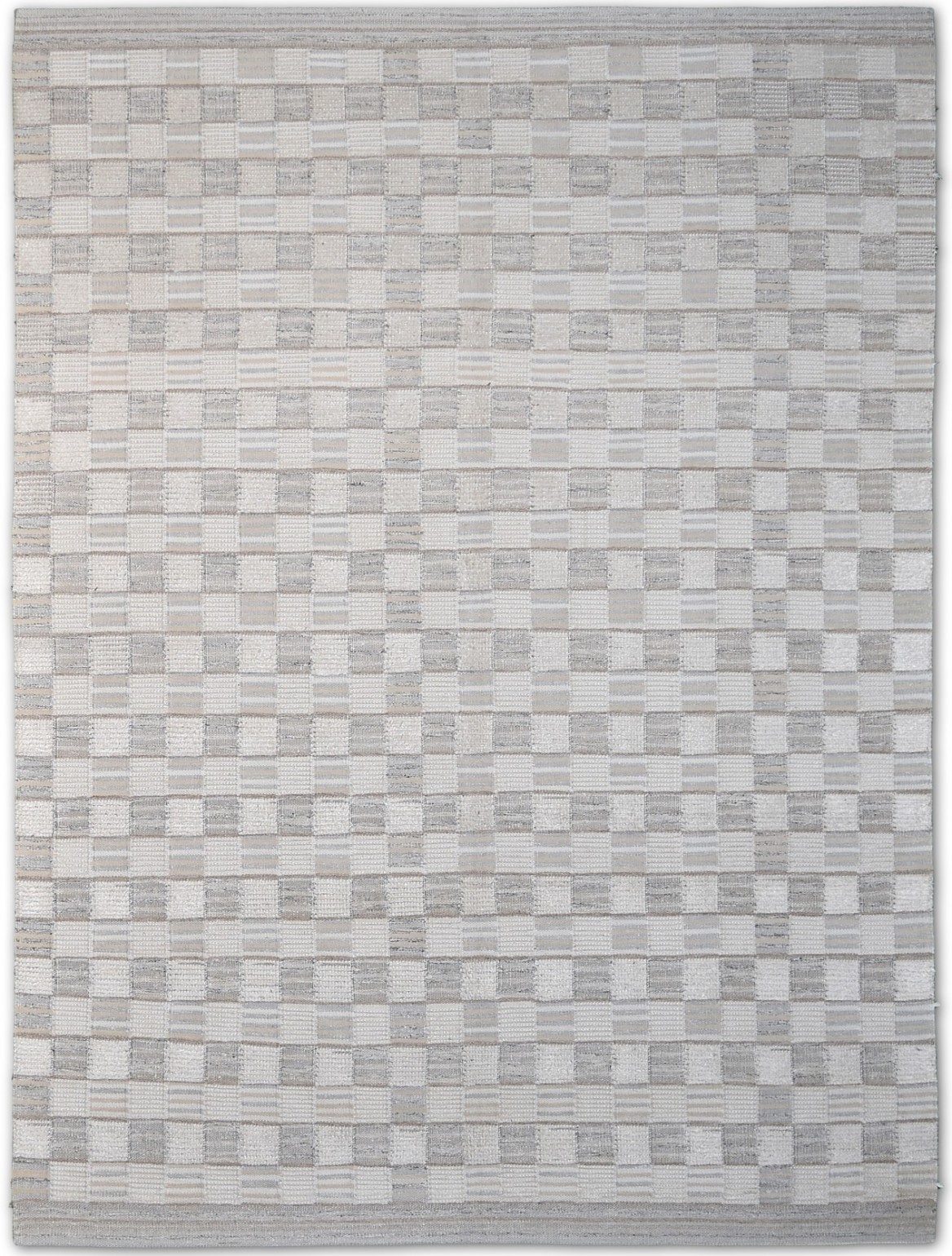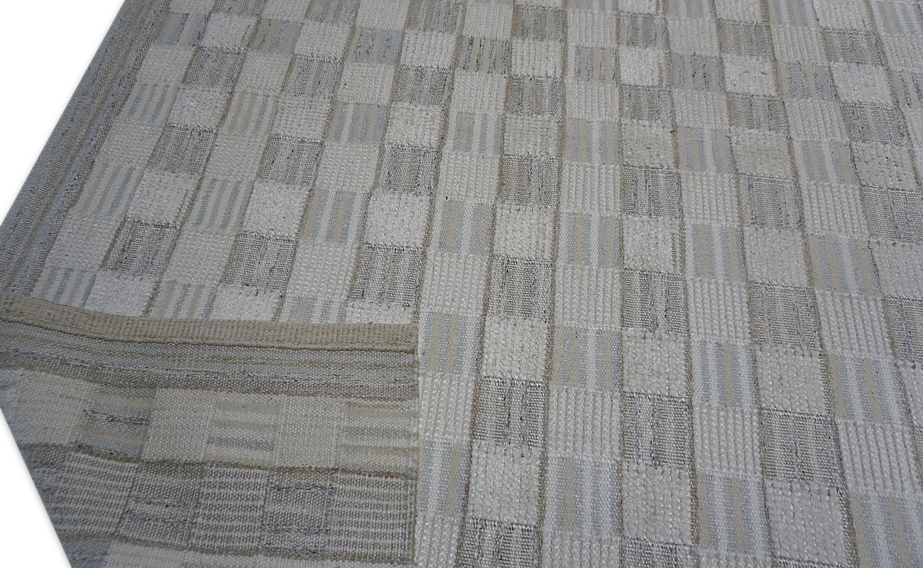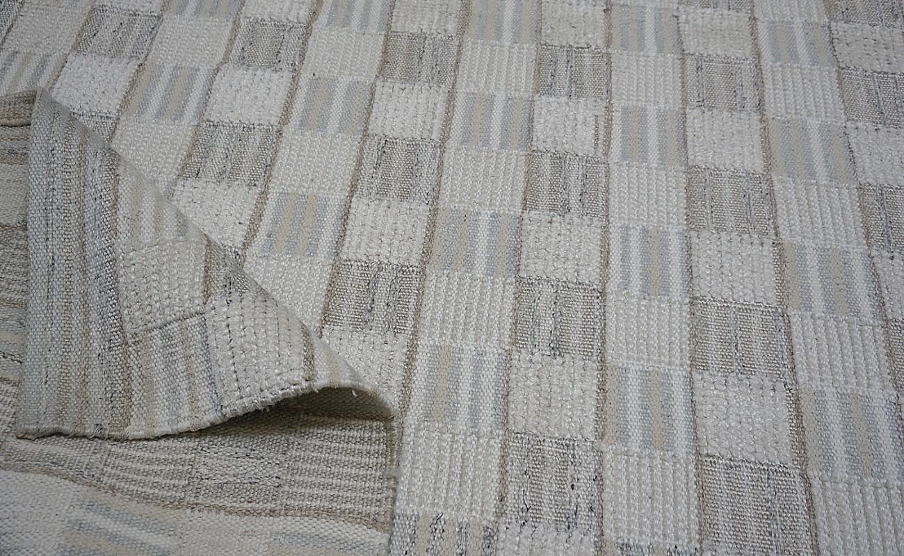 A modern hand knotted Swedish design wool rug offers a flatweave but sturdy ground.