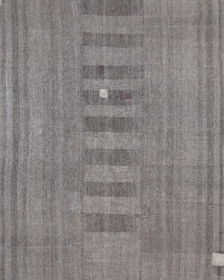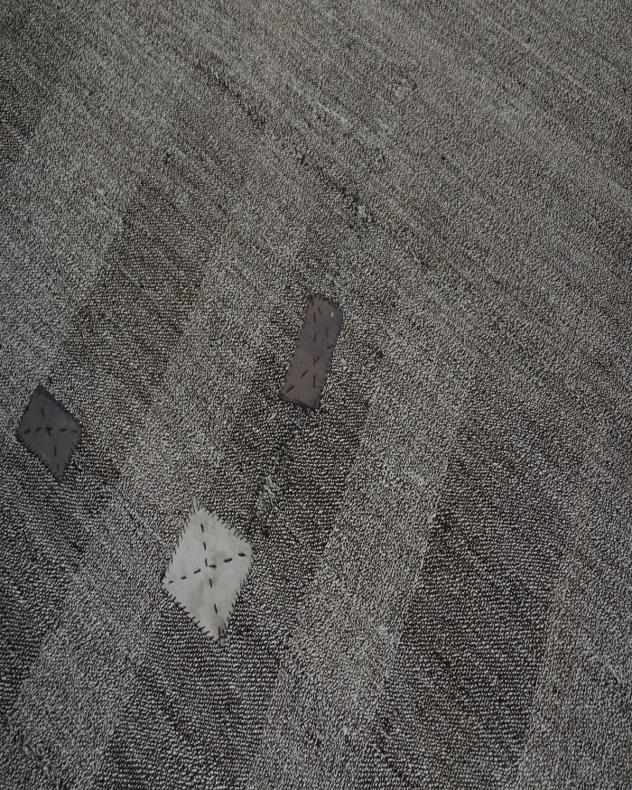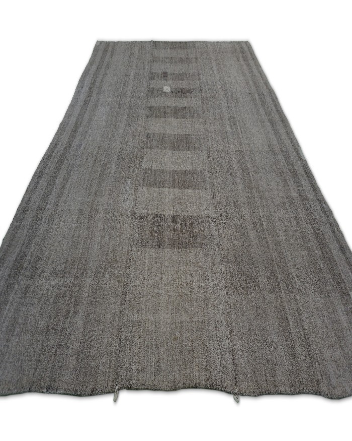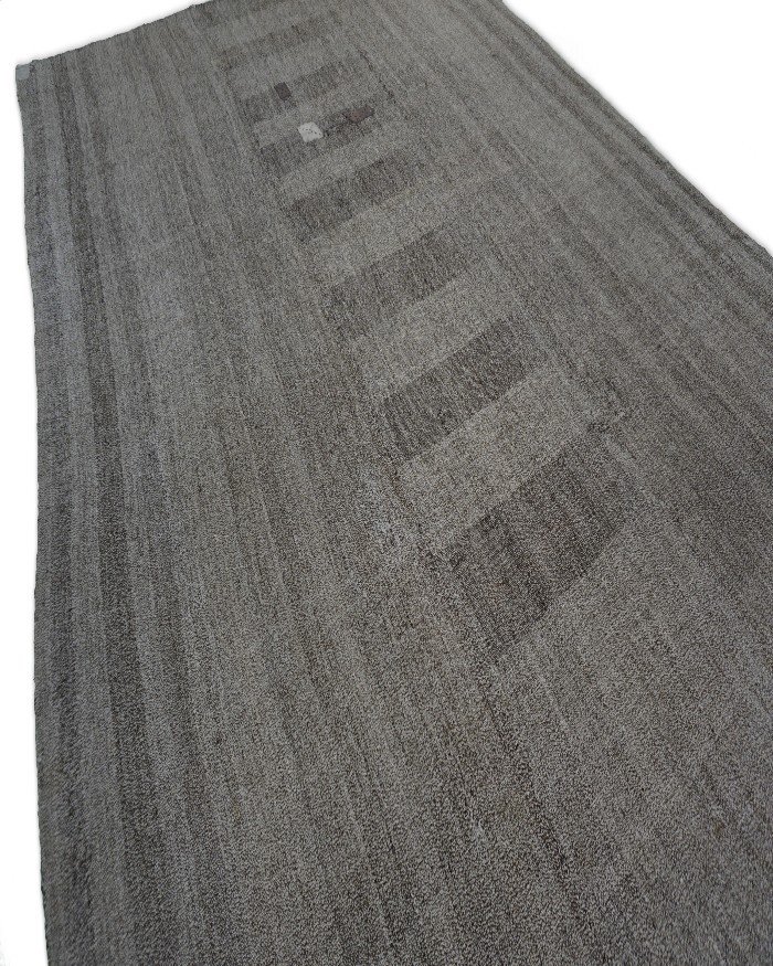A beautiful vintage kilim is handwoven by Master Artisans using handspun goat hair in Turkey. Kilims are flat woven rugs in a technique that comes from Anatolia, parts of Iran, the Caucasus, and Turkestan. This Mazandaran style minimalist kilim offers simple designs in natural colors.