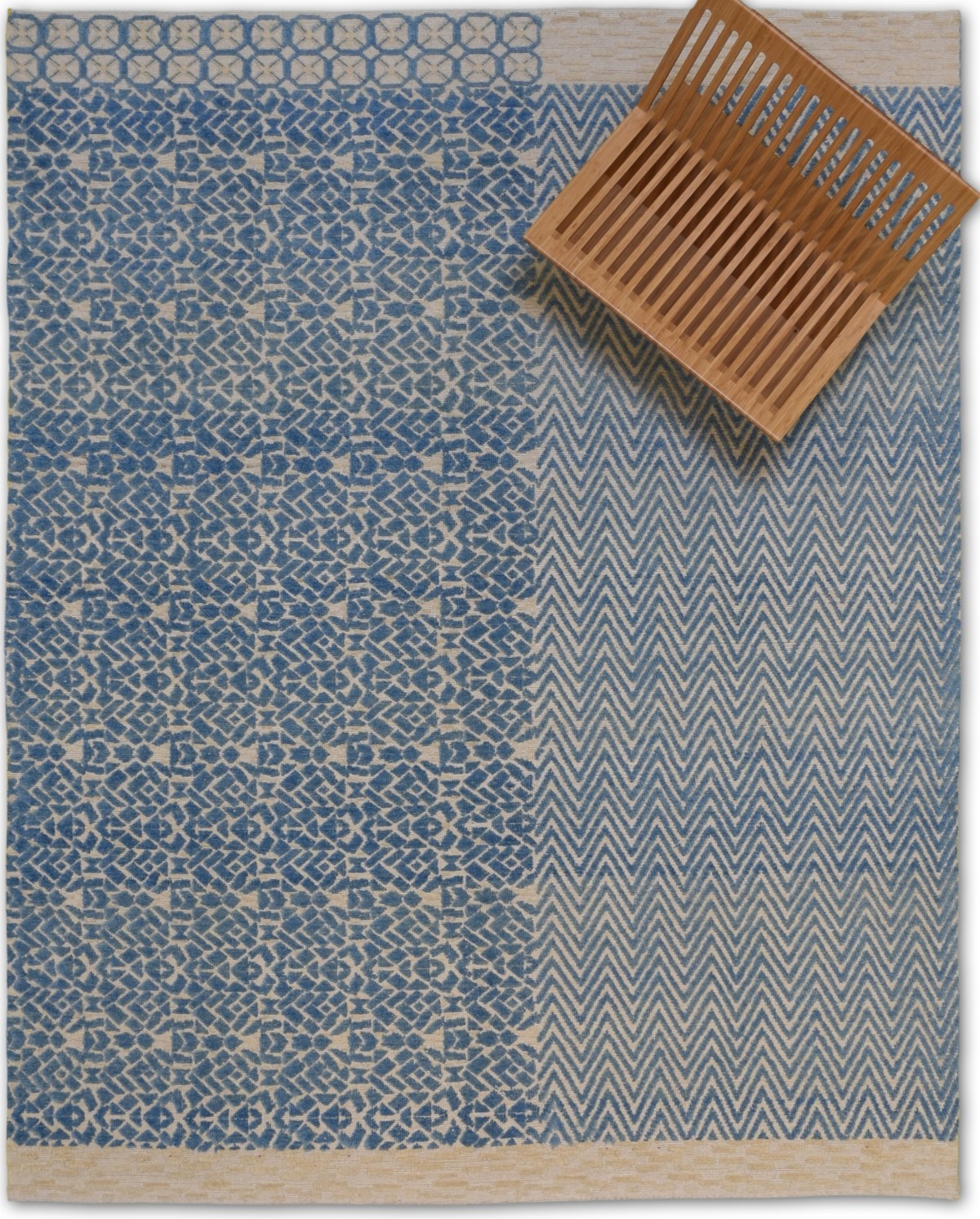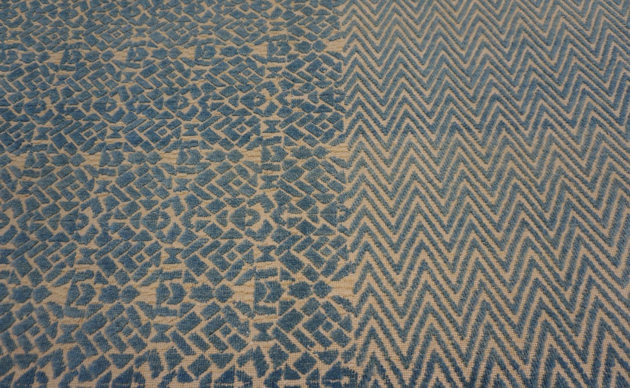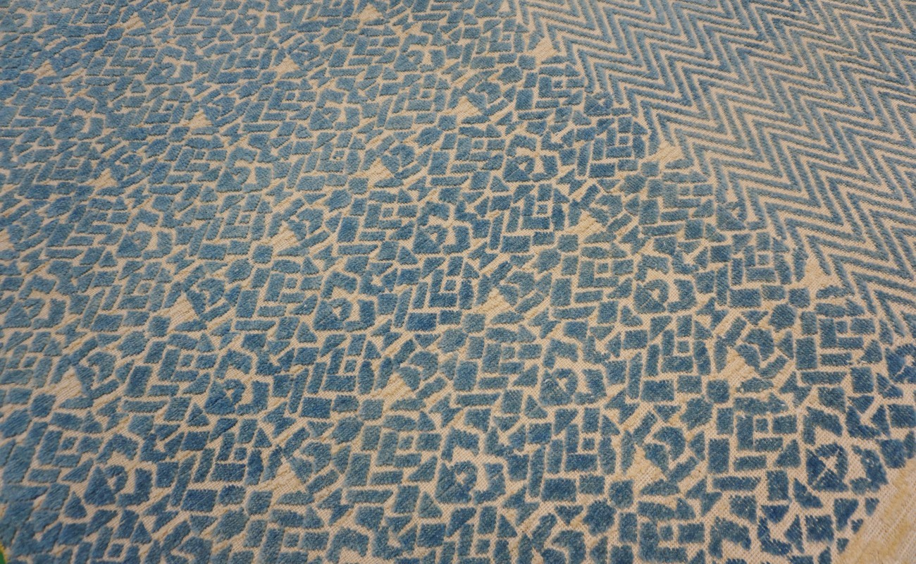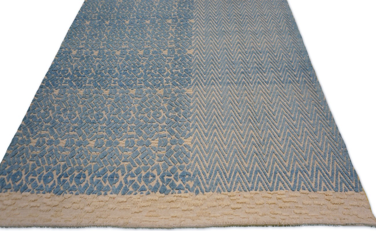 A beautiful modern design using handspun high altitude wool dyed in subtle colors & hand knotted by master weavers & painstakingly finishing process done by Artisans makes this rug a modern masterpiece.