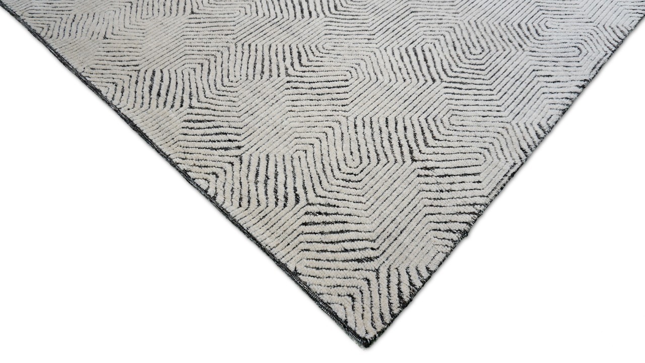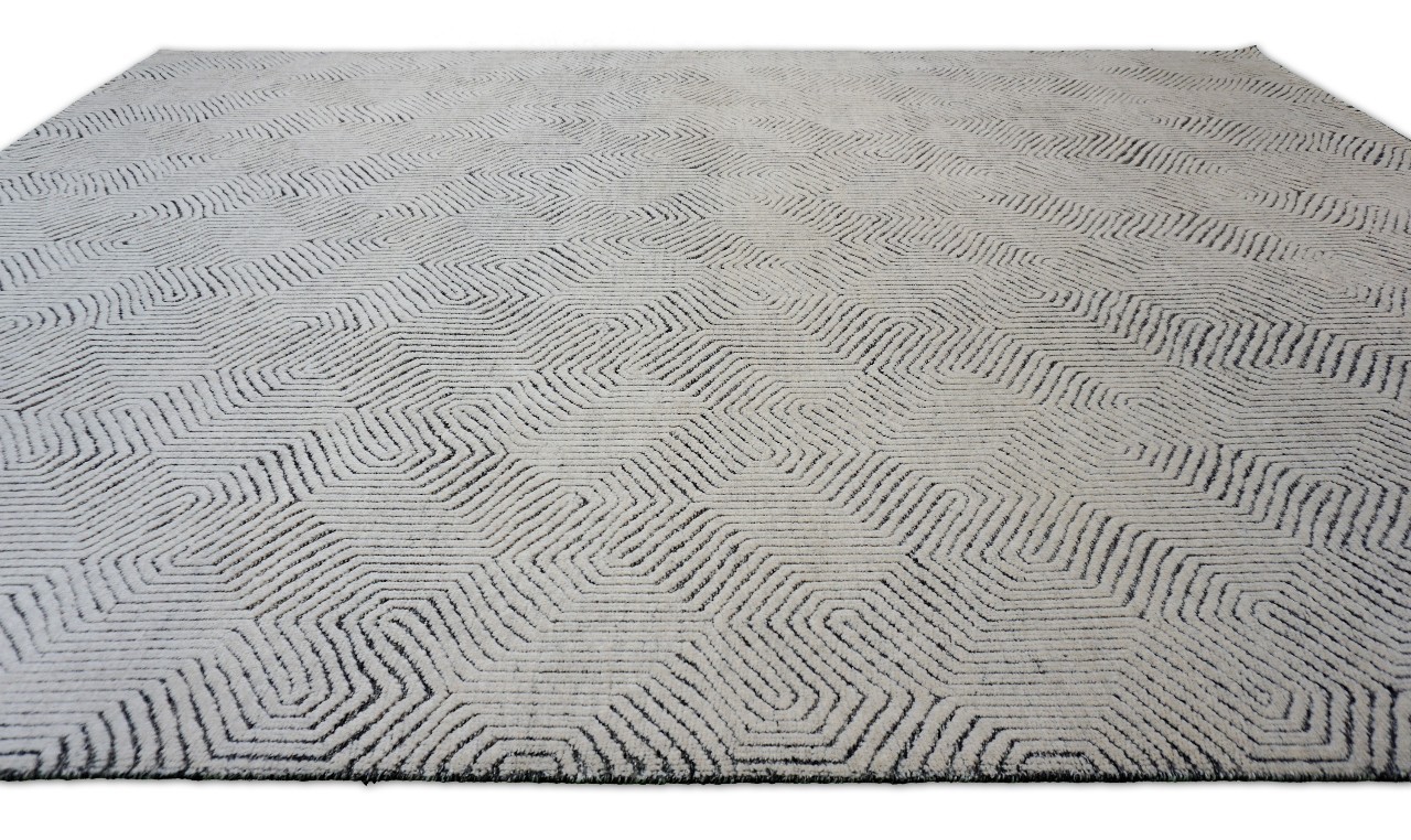 A beautiful modern design using handspun high altitude wool dyed in subtle colors & hand knotted by master weavers & painstakingly finishing process done by Artisans makes this rug a modern masterpiece.