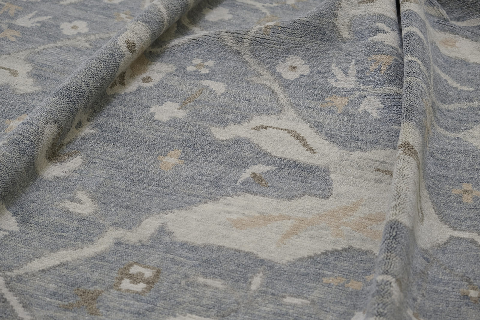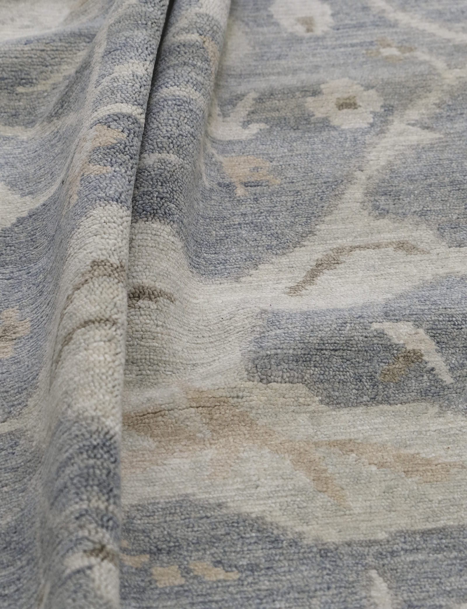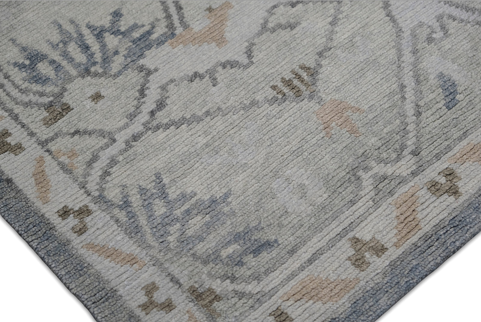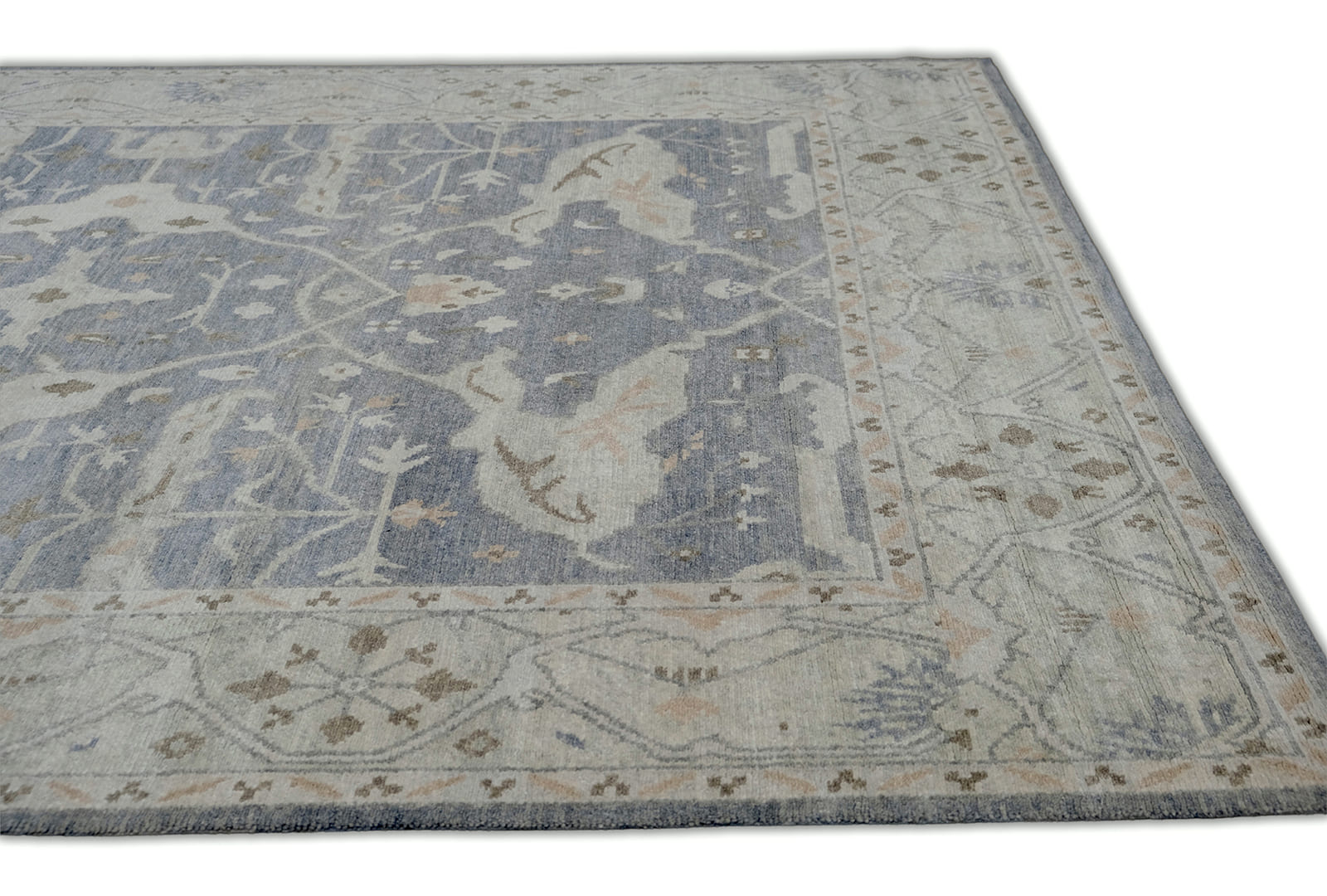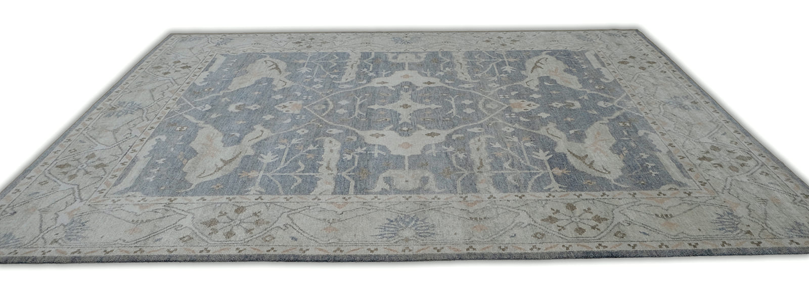 Hand Knotted using Hand spun Wool pile. Heathered Grey blue back ground with soft green border