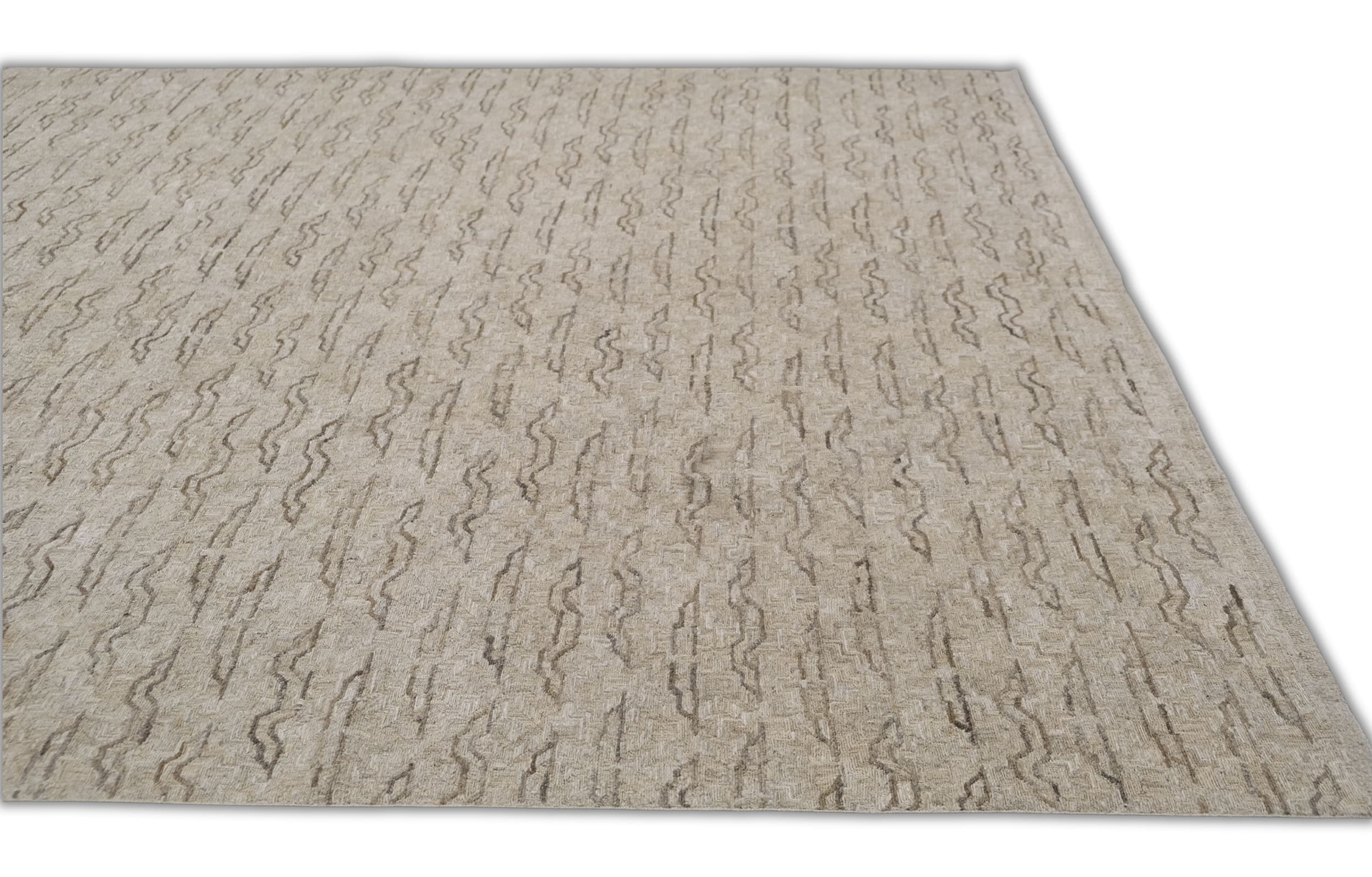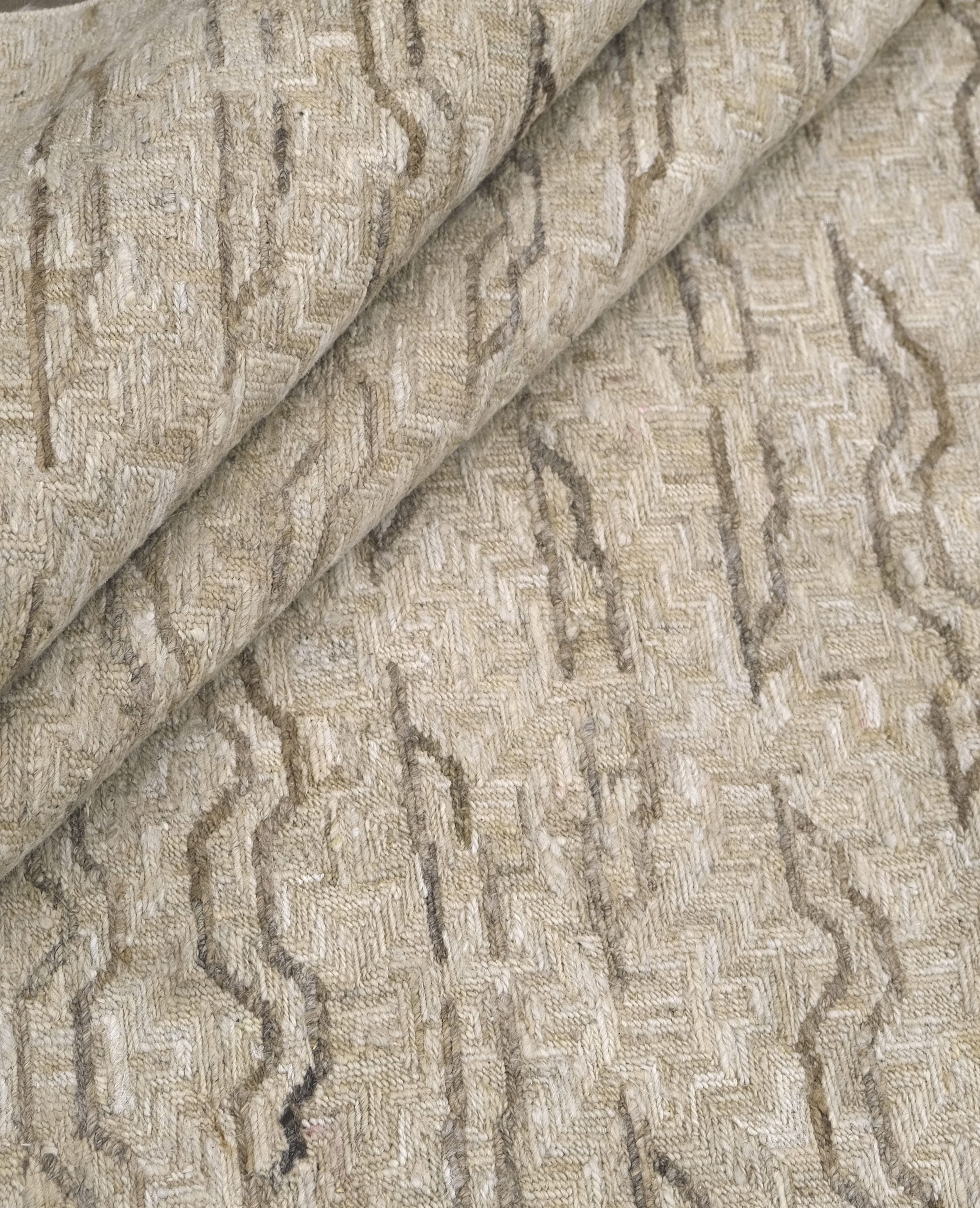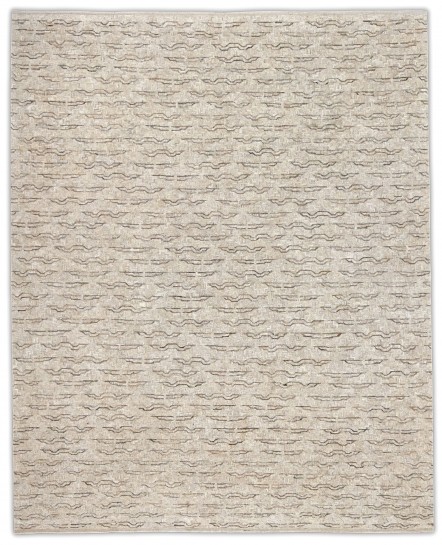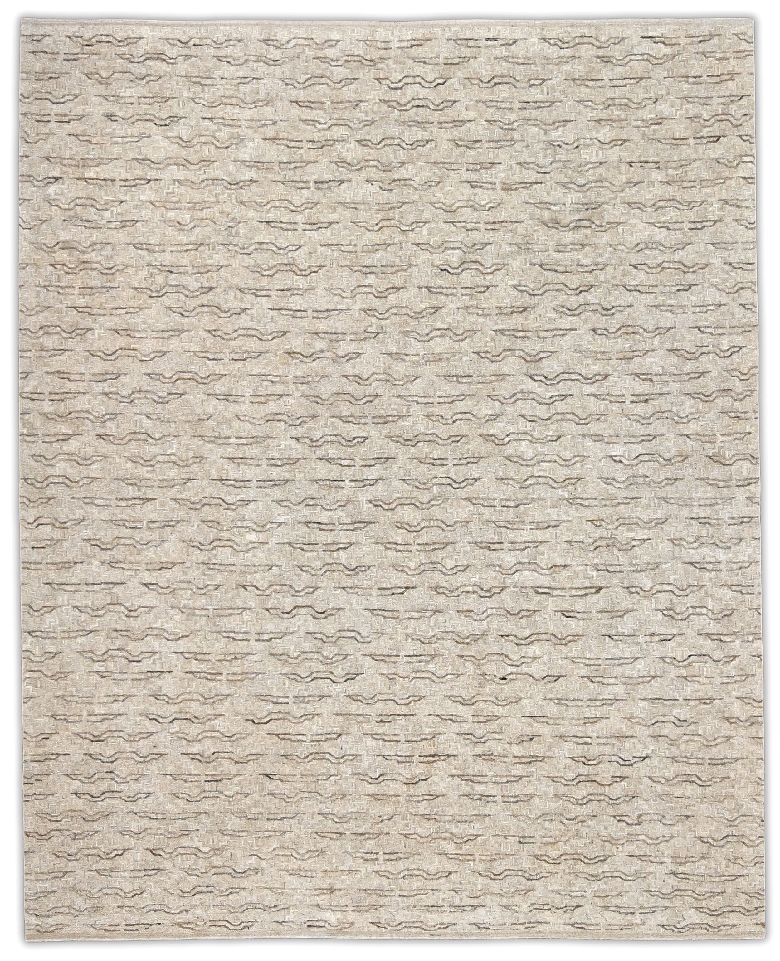 This textured Hand-Woven Hand-Spun wool pile rug features a warm ivory/parchment background. The tone-on-tone palette layers oatmeal and sand with taupe, mushroom-greige, and stone-gray accents, with subtle cocoa in design. A calm, heathered neutral that adds quiet pattern and easy versatility to modern or classic spaces.