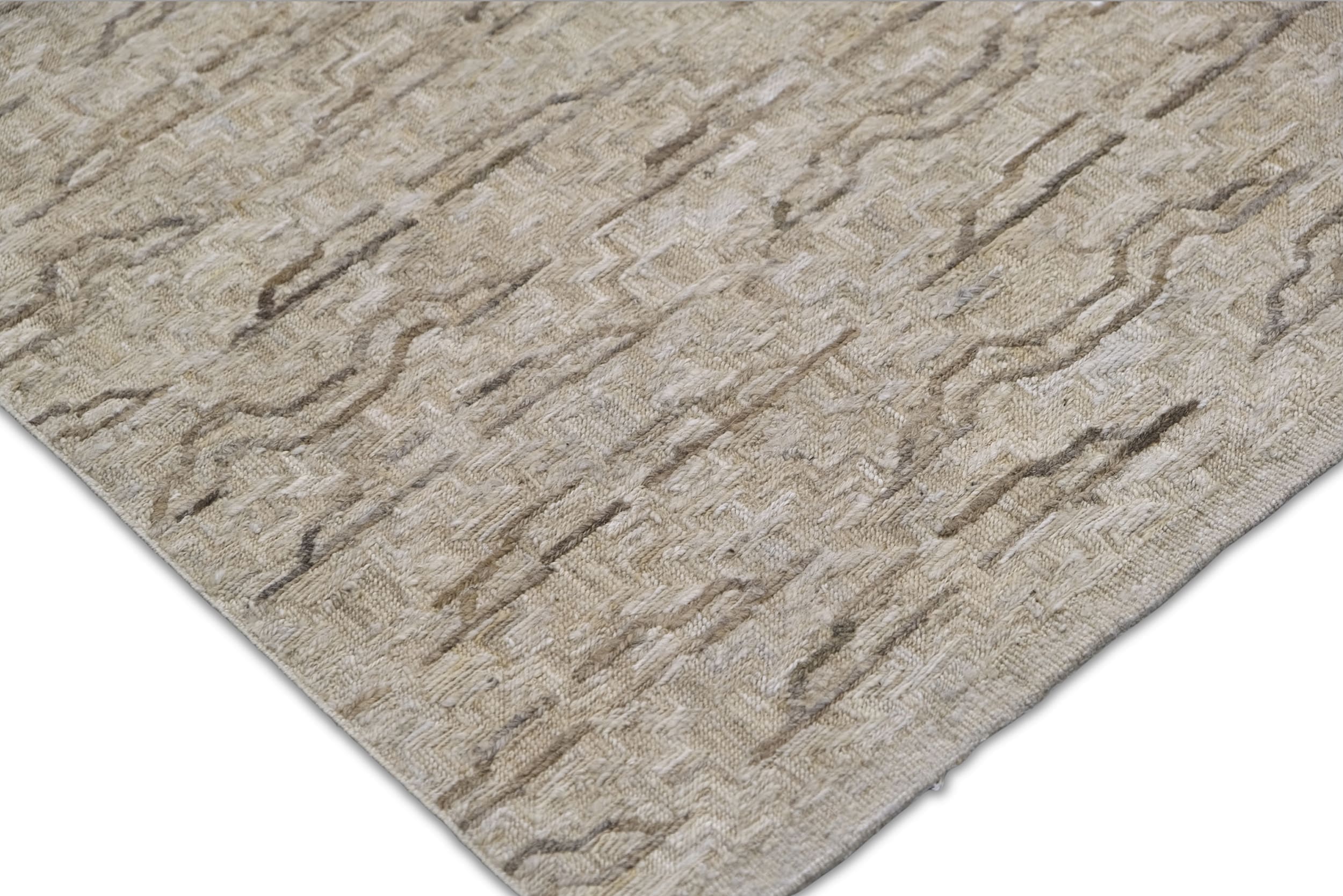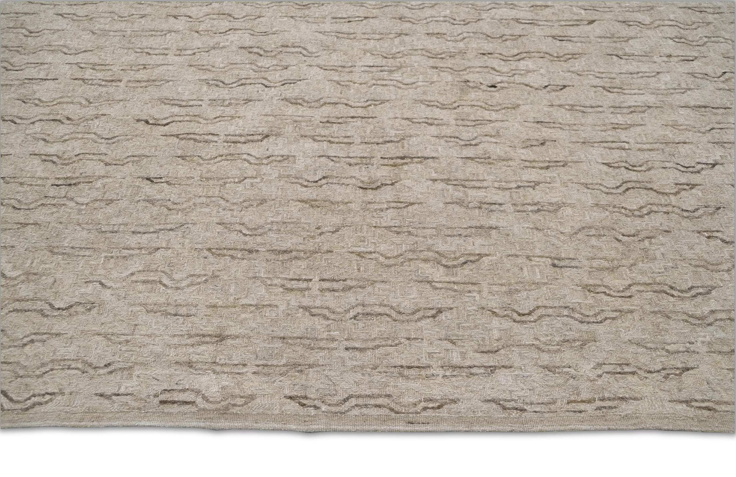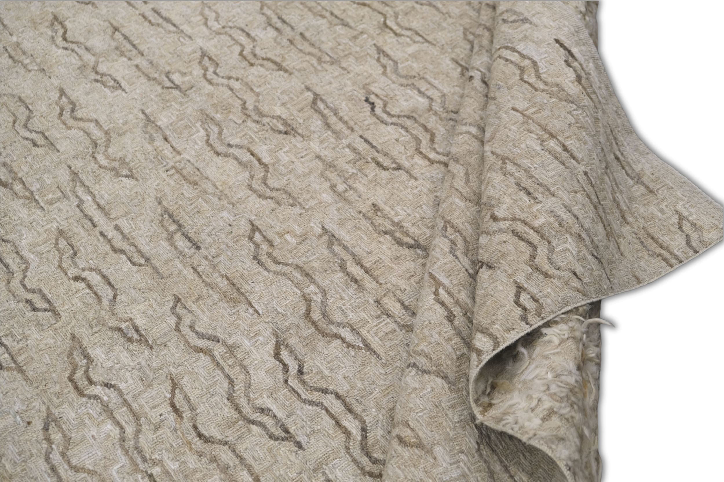 This textured Hand-Woven Hand-Spun wool pile rug features a warm ivory/parchment background. The tone-on-tone palette layers oatmeal and sand with taupe, mushroom-greige, and stone-gray accents, with subtle cocoa in design. A calm, heathered neutral that adds quiet pattern and easy versatility to modern or classic spaces.