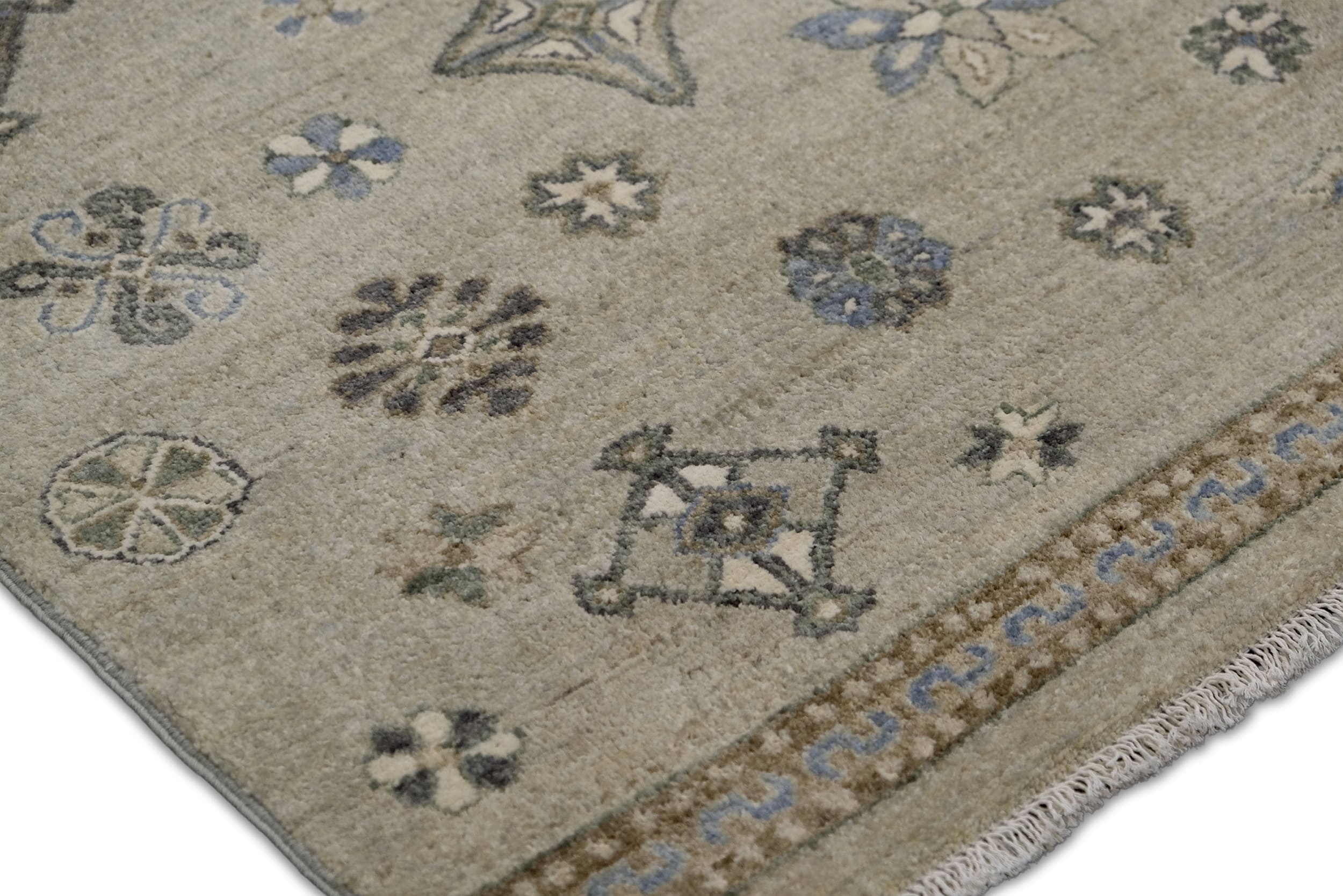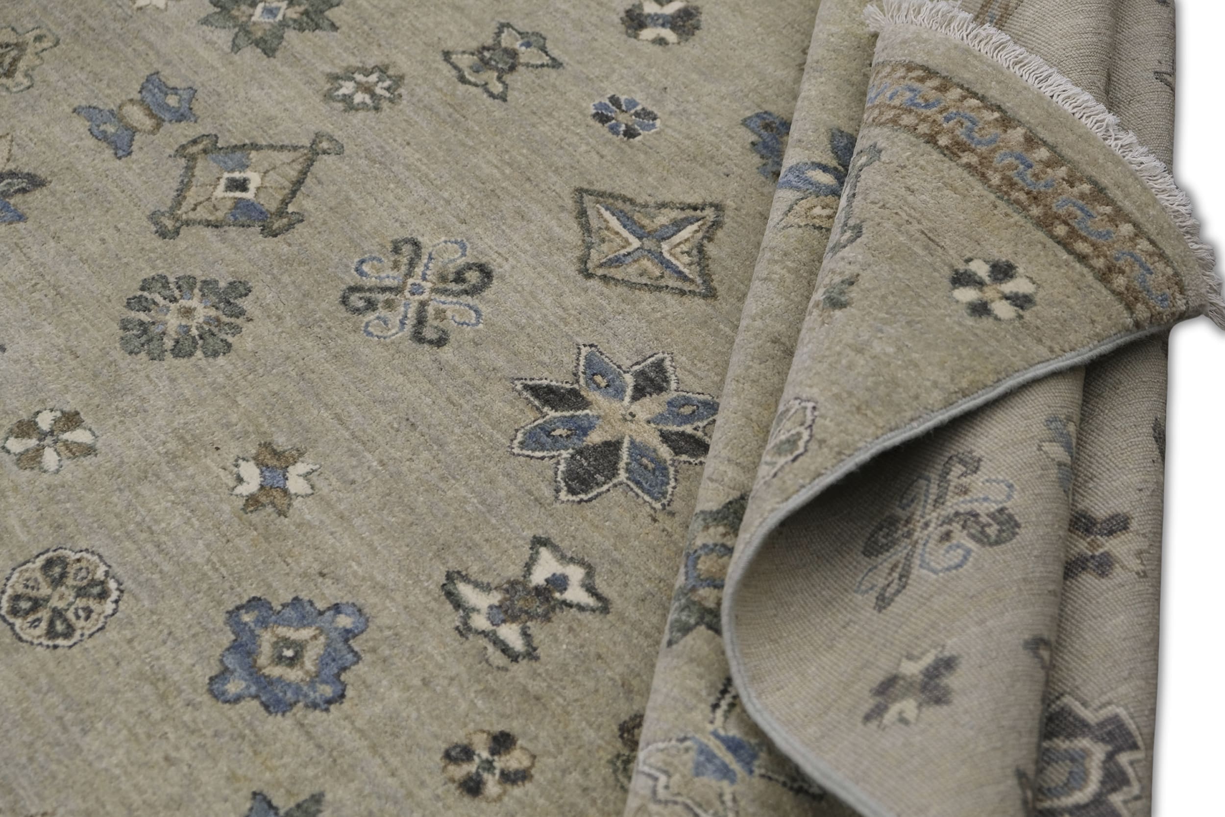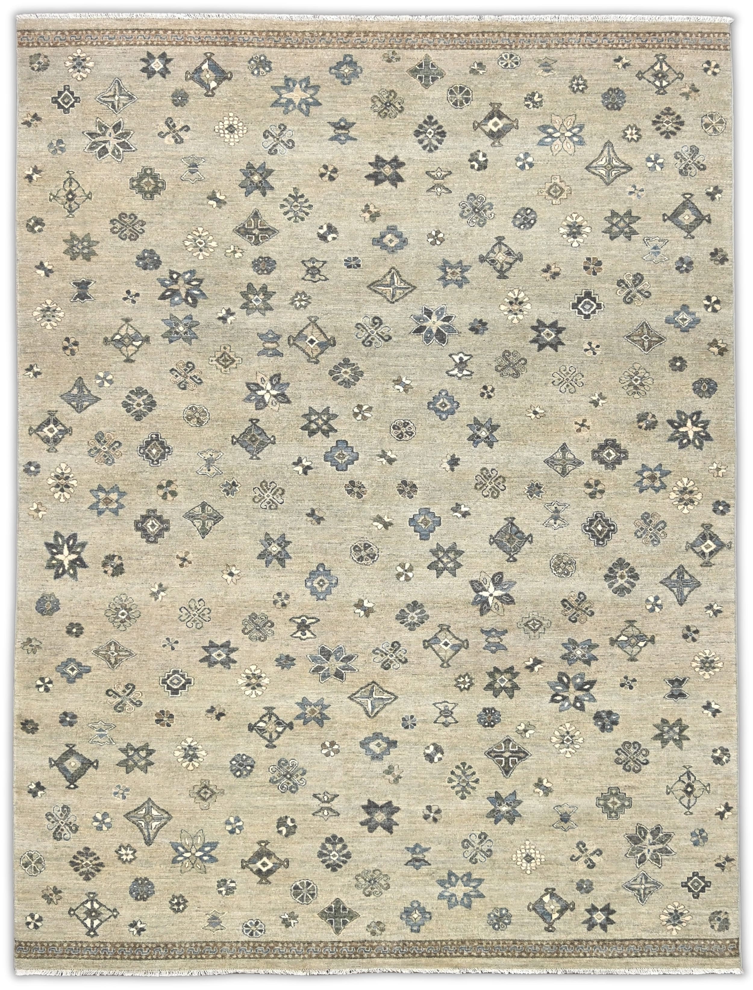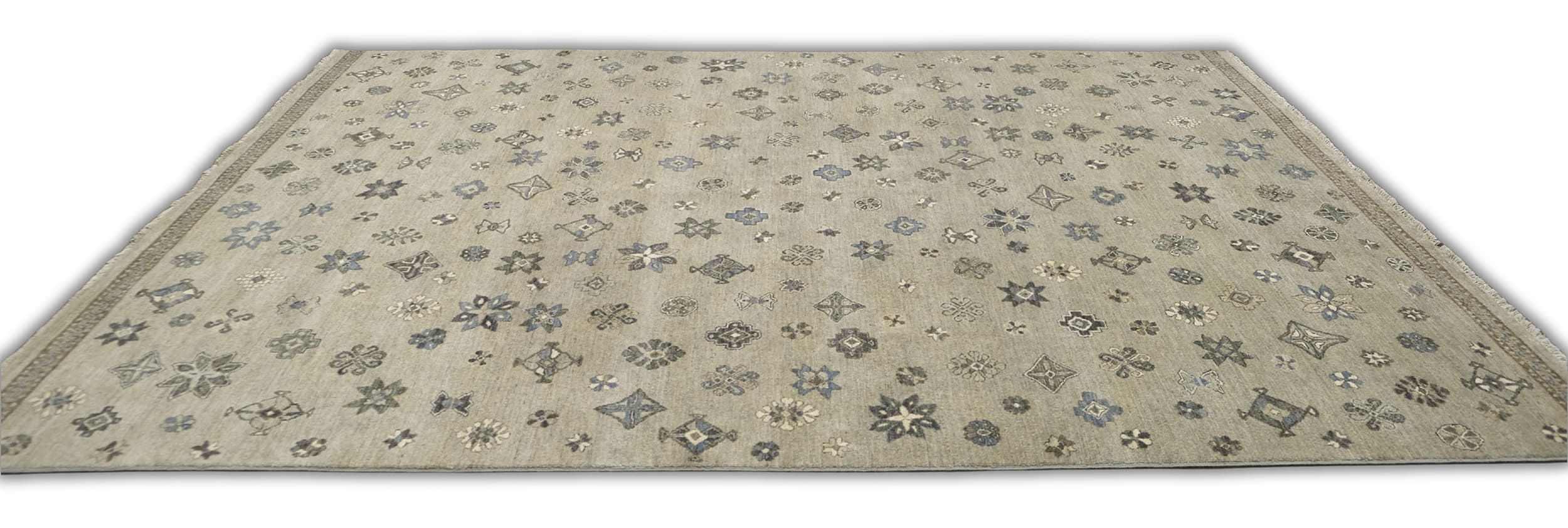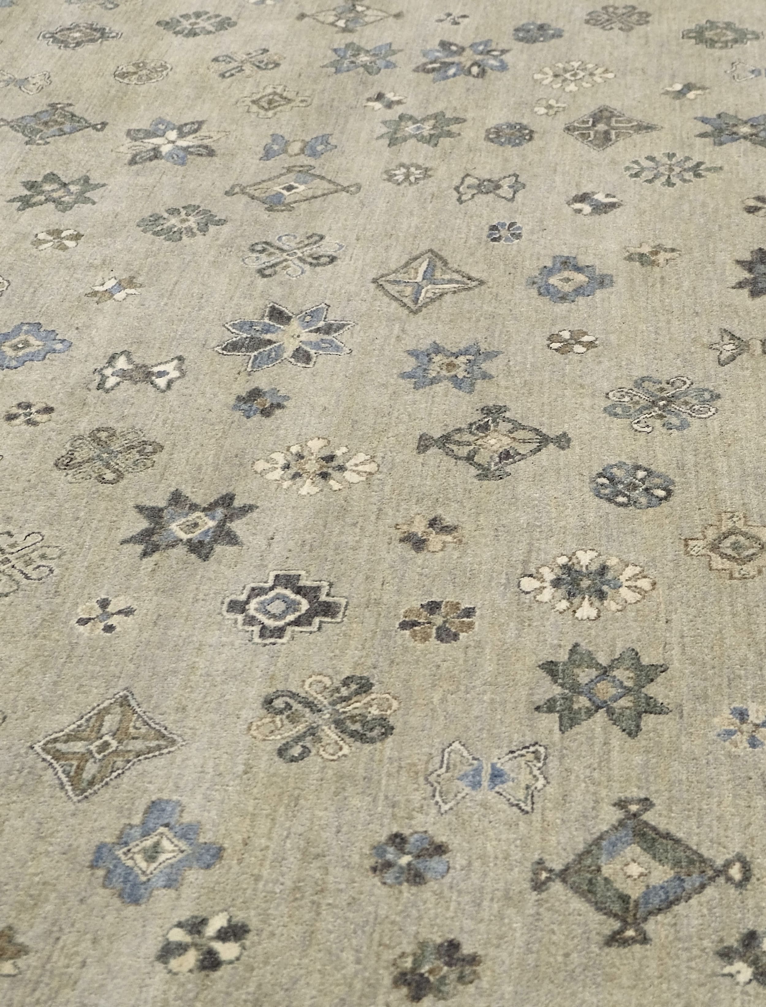 Hand-Knotted, Hand-Spun Wool pile rug in a warm Greenish beige background. Motifs layer slate and denim blues with charcoal, green , ivory and calm neutrals—an elegant, versatile design for modern or classic rooms.