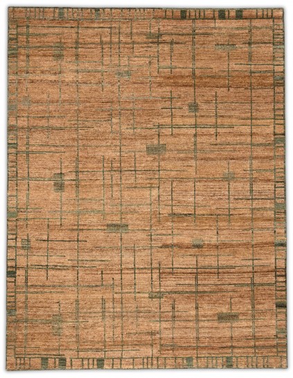 Hand-knotted in Hand-spun textured wool pile. Salmon background with sage/olive accents. This rug brings warm, mid-century elegance to contemporary spaces.
