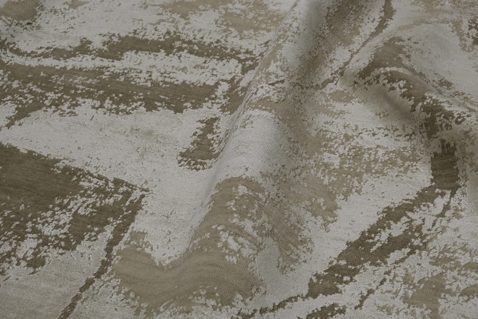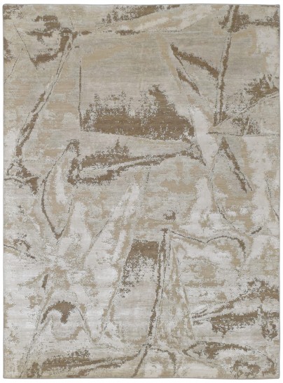 This is a luxurious hand-knotted rug crafted from a blend of wool and bamboo silk. The design features an abstract pattern with a soft interplay of neutral tones, including beige, ivory, and light brown, creating a modern and sophisticated look. The rug's texture is rich and plush, offering durability and a silky sheen that enhances its visual appeal. It would make an elegant addition to contemporary or transitional interiors.