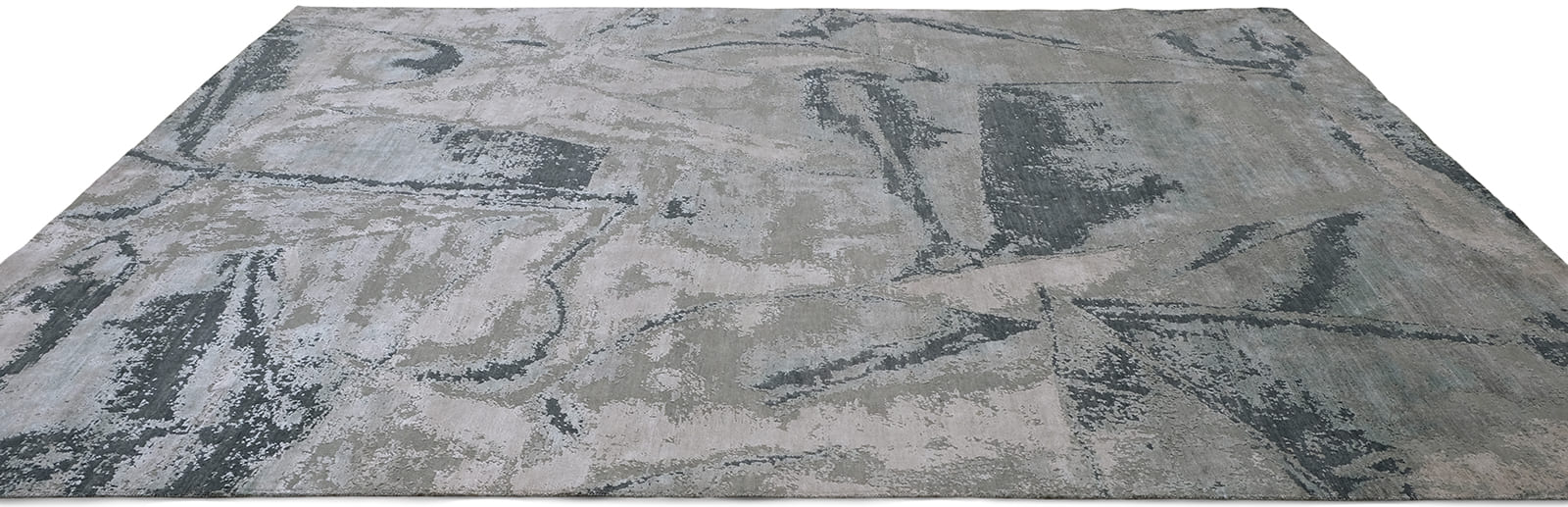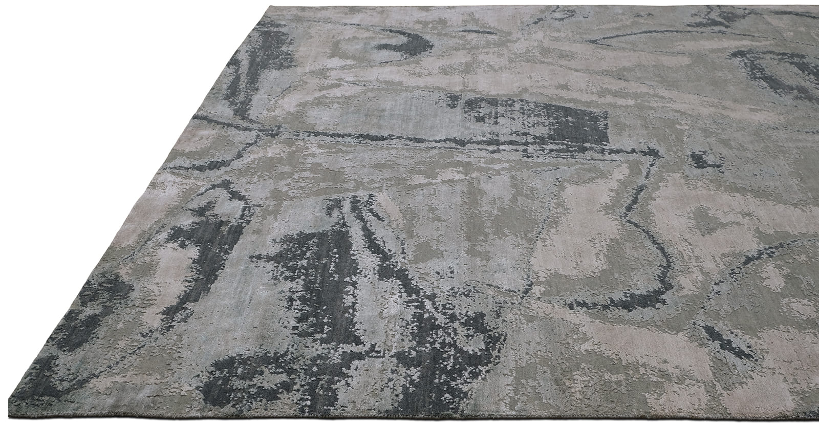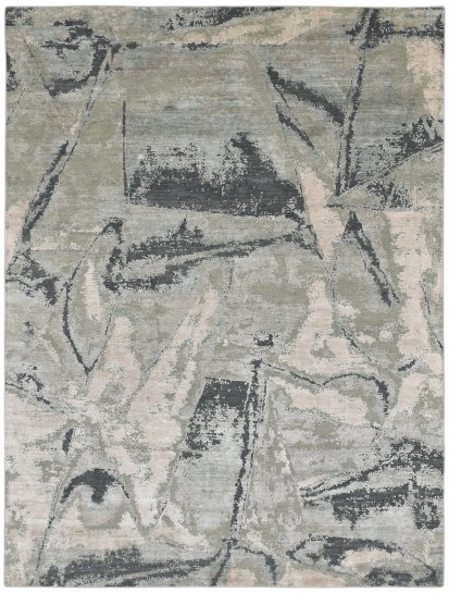 This hand-knotted rug, made from a premium blend of wool and bamboo silk, features an abstract design in soft hues of greens. The subtle textures and intricate patterning create a contemporary aesthetic with a luxurious sheen, making it both visually captivating and durable. Its modern elegance makes it a perfect choice for sophisticated living spaces.