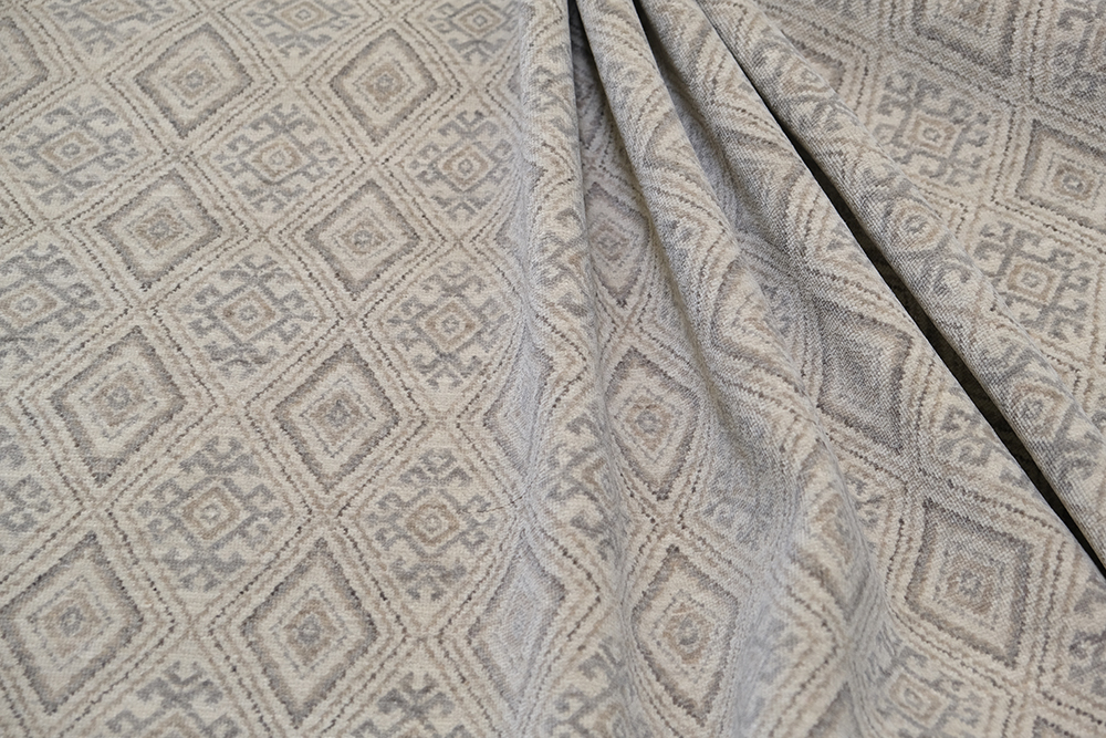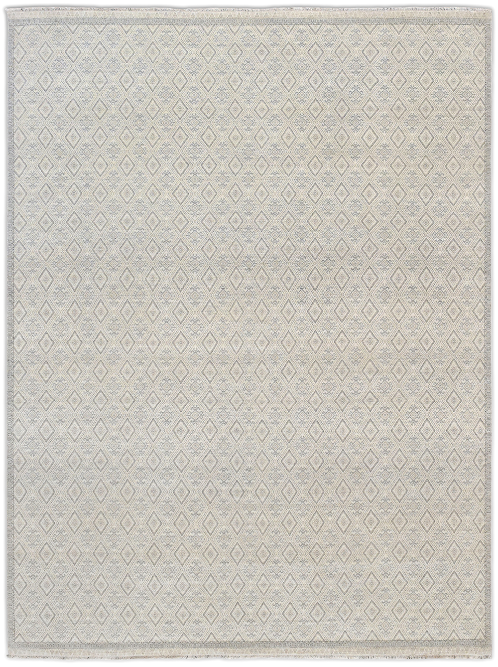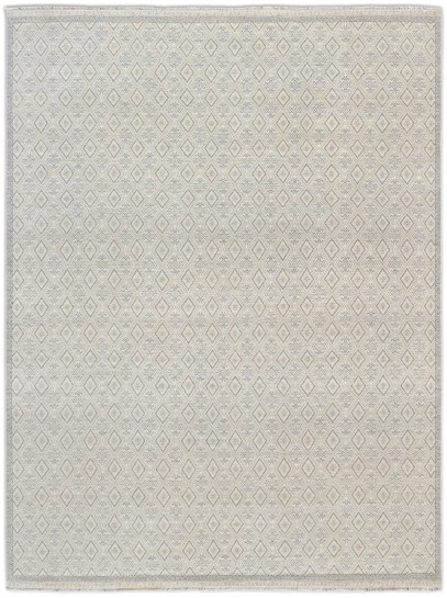 Hand-knotted very fine wool rug featuring a refined and symmetrical geometric pattern. The design consists of repeating diamond shapes that create a sense of harmony and balance. The color palette is subtle, with variations of beige and light gray, which gives the rug a sophisticated and versatile appearance, suitable for complementing various interior decors.