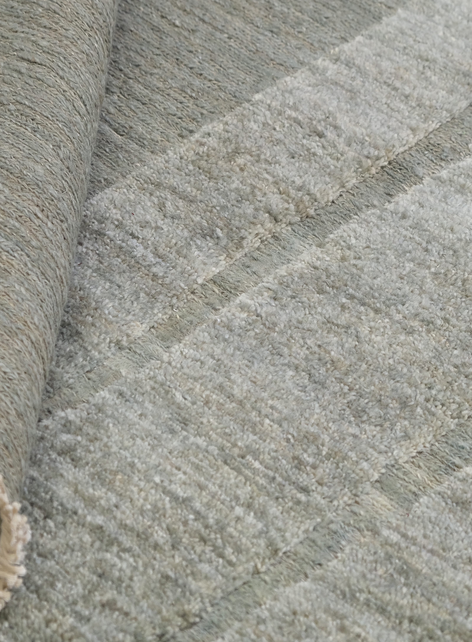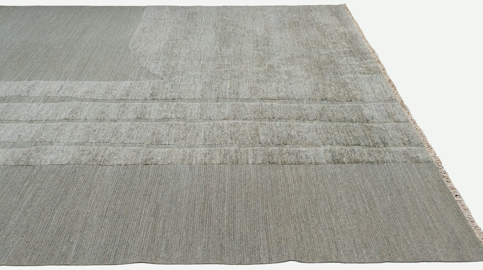 This exquisite hand-knotted wool rug from Pakistan features a unique blend of high cut pile and soumak weave, creating a harmonious contrast between textures. Its sophisticated, minimal design showcases a subtle interplay of tones and patterns, making it a refined choice for modern interiors. The high-quality wool adds warmth and durability, while the low-pile soumak weaving technique brings depth and visual interest. Ideal for those who appreciate craftsmanship and understated elegance, this ru