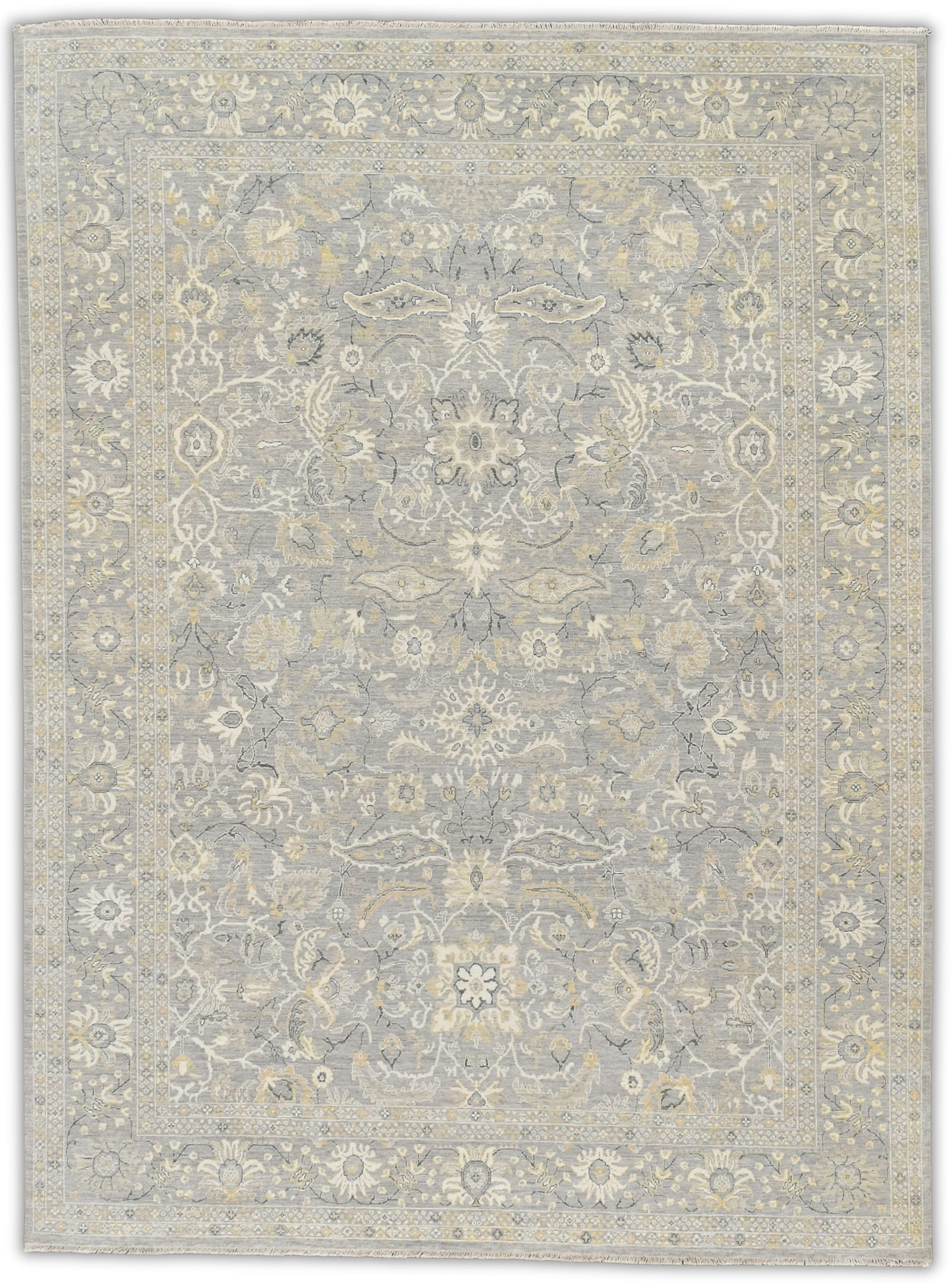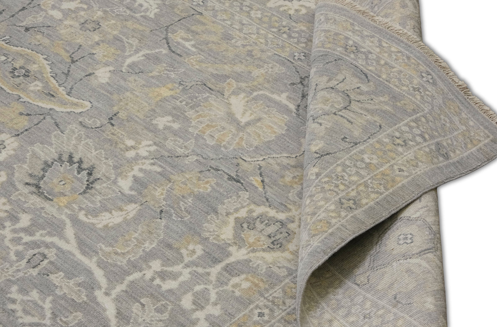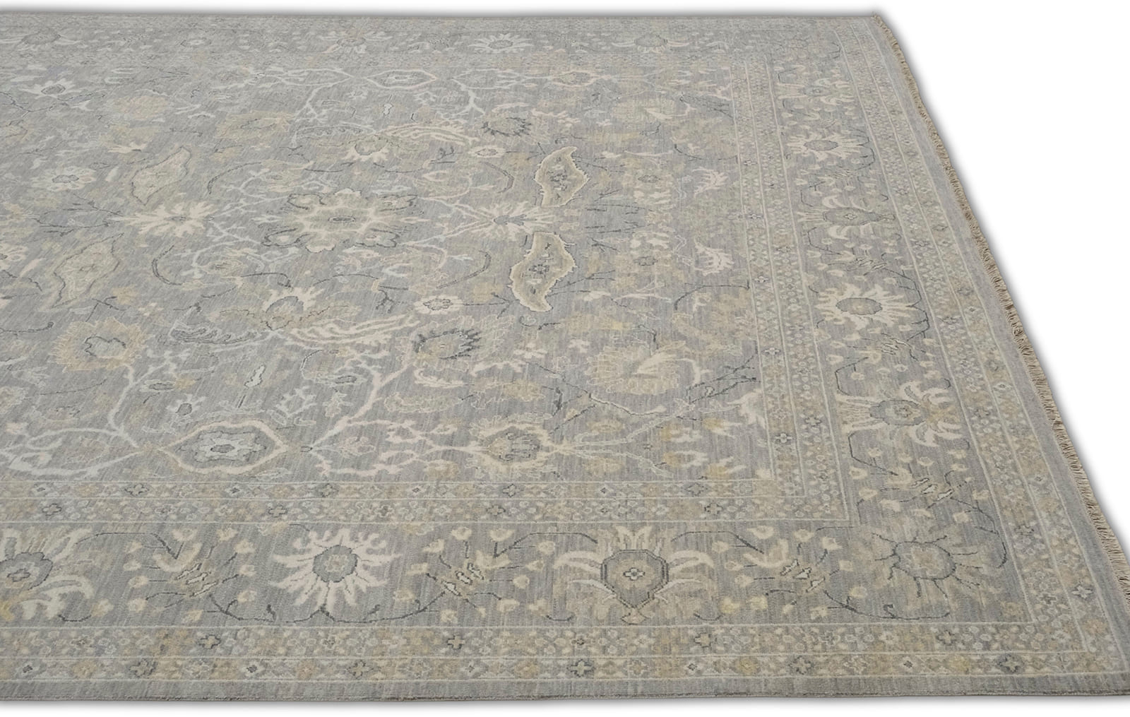 Hand-knotted very fine wool rug with a overall pattern. The rug is composed of a vintage color palette with shades of green, blue and grey that create a tranquil and vintage look.