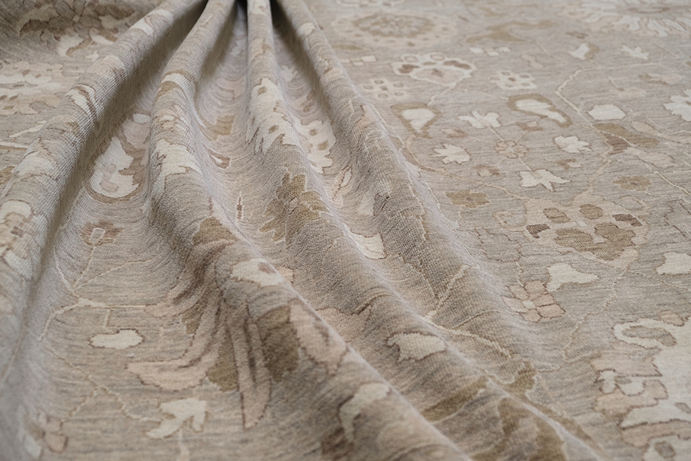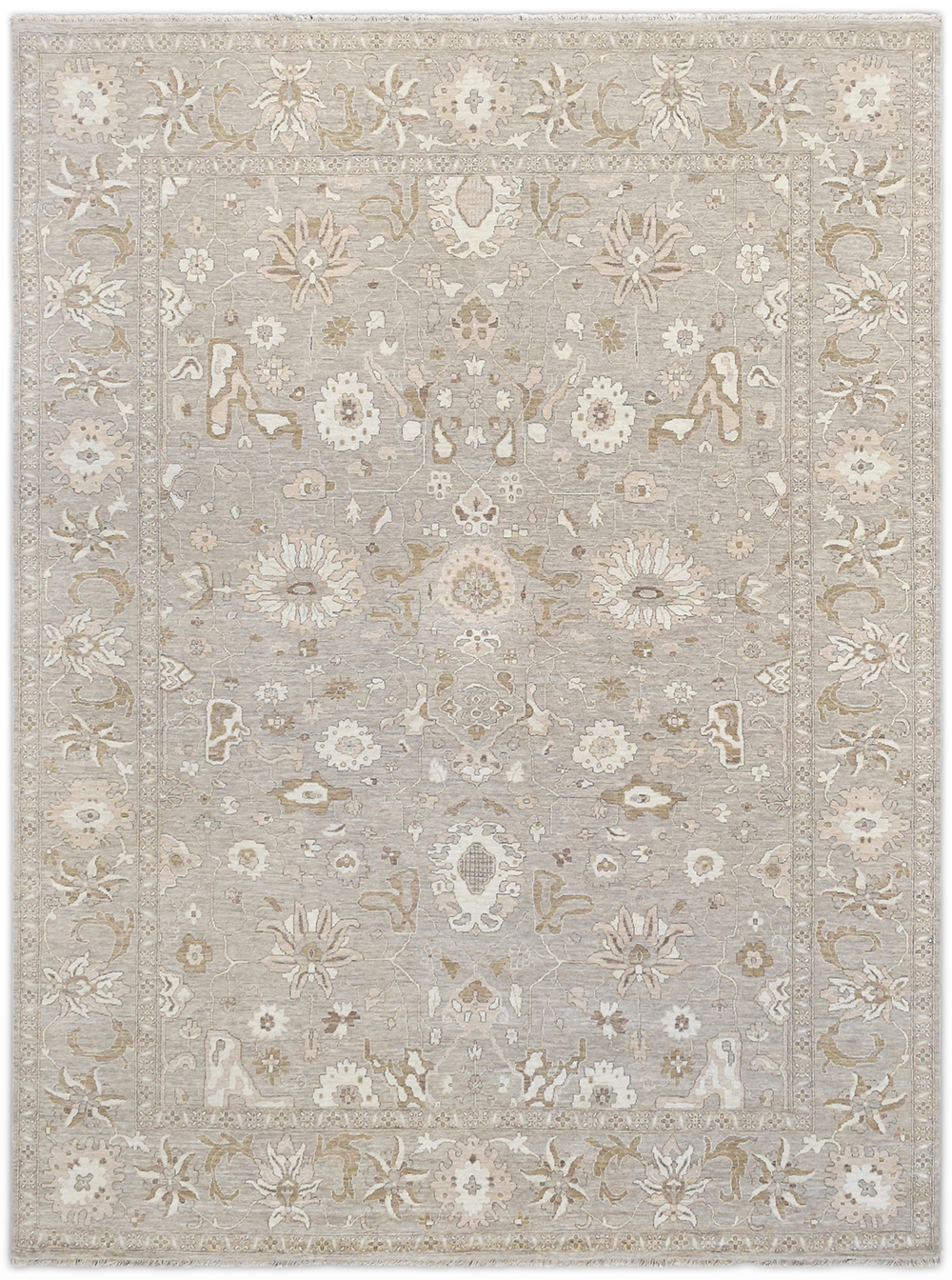 Hand-knotted very fine wool rug with a sophisticated floral design. The rug is composed of a muted color palette with shades of beige, taupe, and ivory that create a tranquil and elegant look. The pattern is detailed with various botanical elements, including flowers, leaves, and vines, which are symmetrically arranged to give a sense of balance and serenity. The borders of the rug are intricately designed with a similar floral motif that complements the central area.