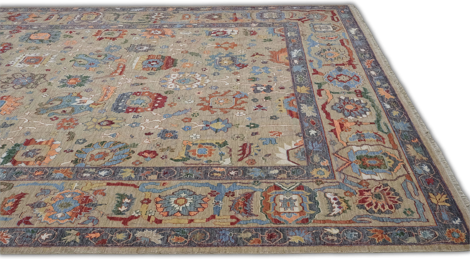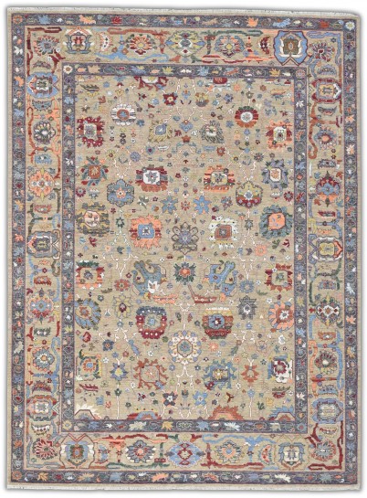 Hand-knotted wool rug featuring the Sultanabad pattern, renowned for its rich history and artistry. The rug boasts a vibrant brwon background, embellished with a diverse array of floral motifs and intricate designs in hues of red, green, blue, and orange. Each pattern element is carefully crafted, showing off the exceptional skill involved in its creation. The border is equally detailed, containing a series of smaller patterns that frame the central design beautifully. This rug’s classic Sultana