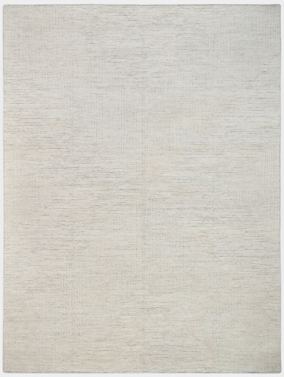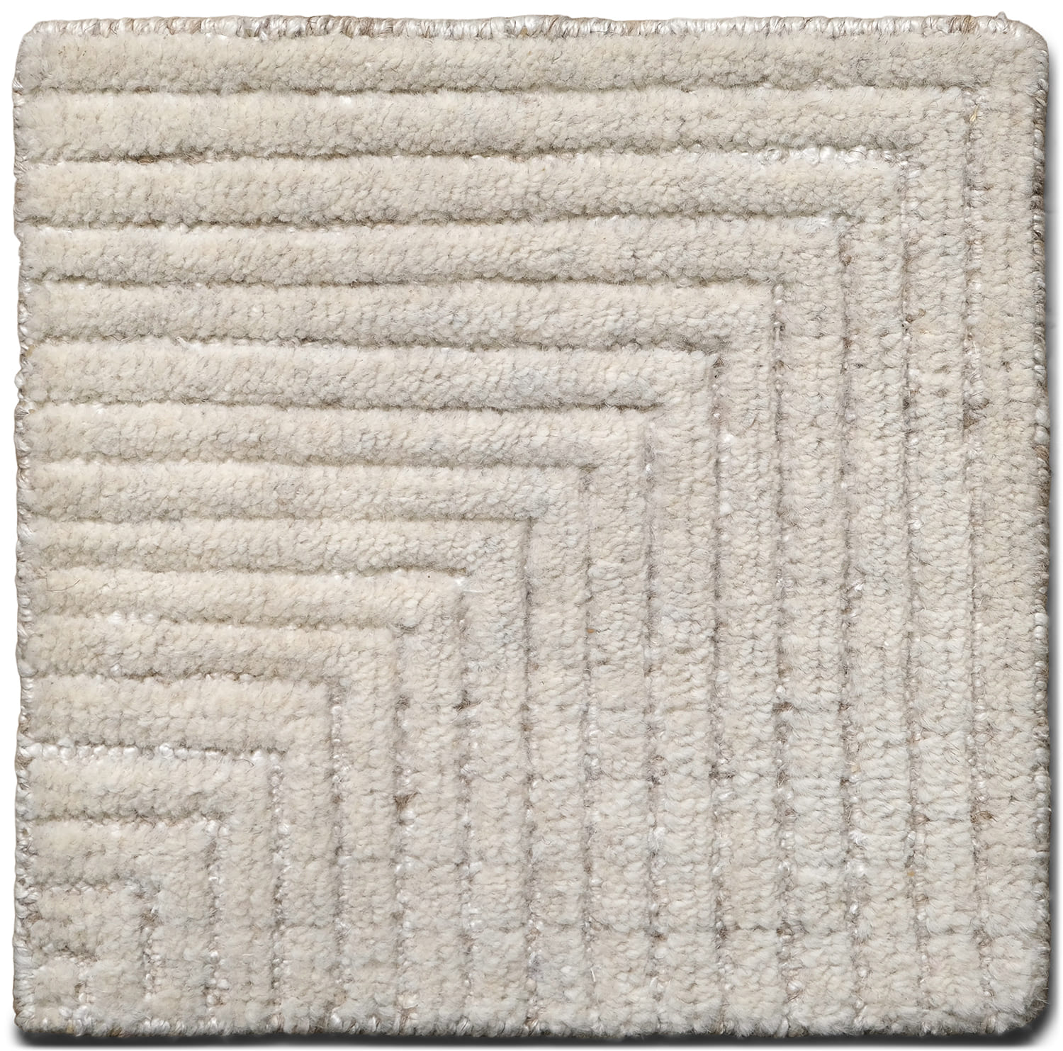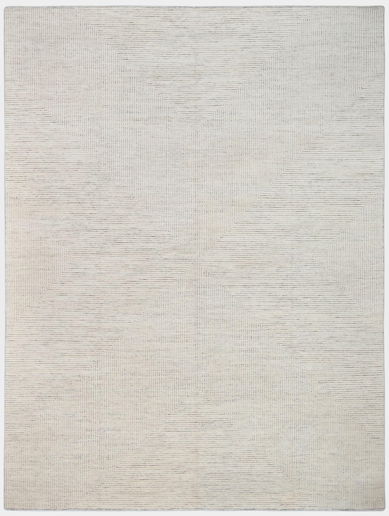 This hand-knotted wool rug features a sophisticated high-low texture that adds depth and dimension to its design. The rug's elegant geometric pattern, rendered in subtle, neutral tones, makes it a versatile addition to any upscale interior.