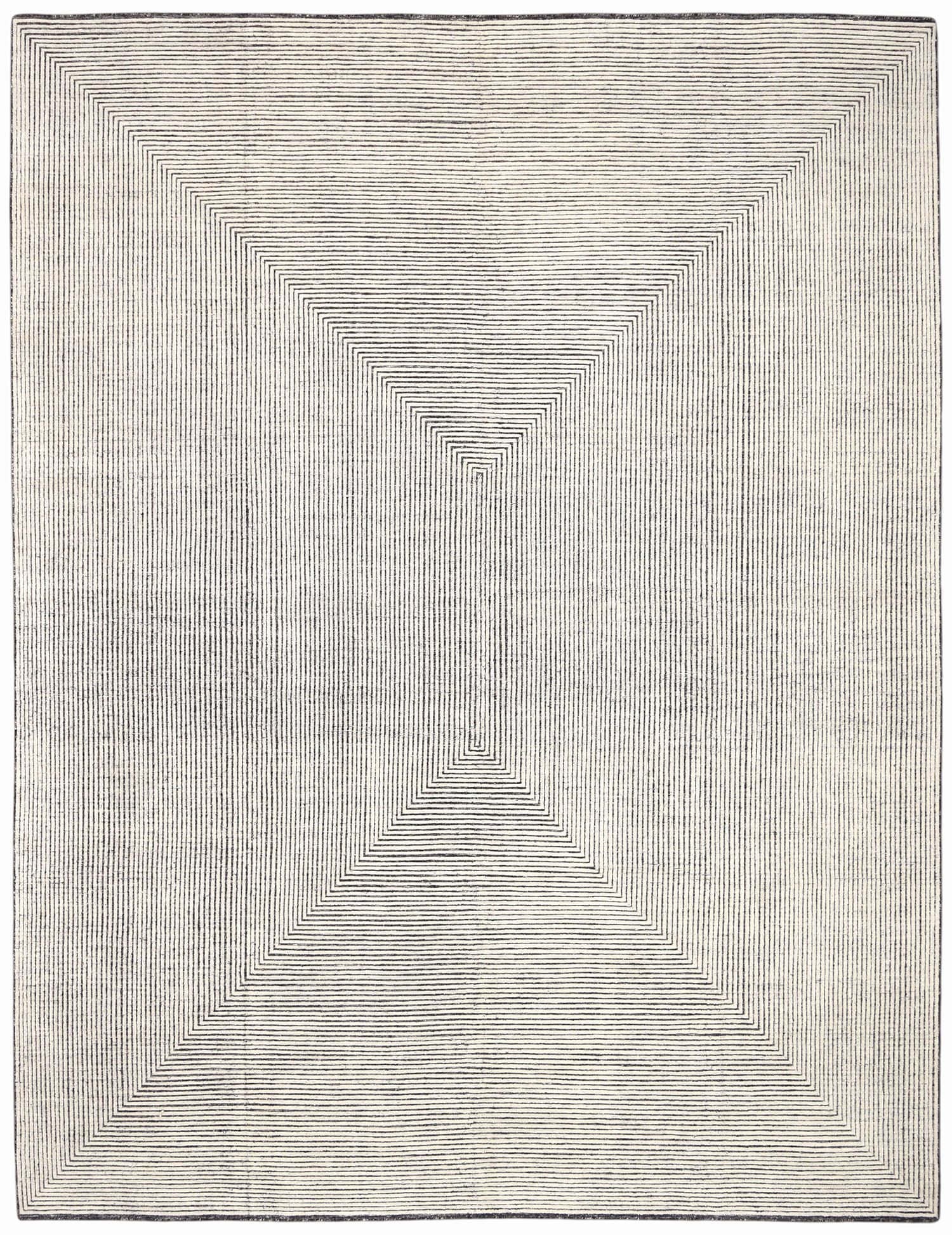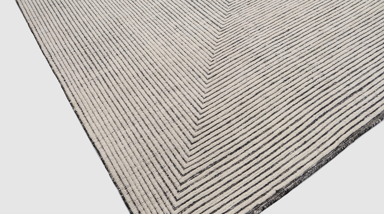 This hand-knotted wool rug features a sophisticated high-low texture that adds depth and dimension to its design. The rug's elegant geometric pattern, rendered in subtle, neutral tones, makes it a versatile addition to any upscale interior.